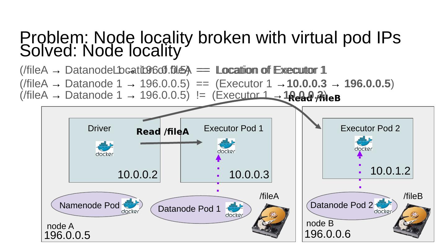 25 .Problem: Node locality broken with virtual pod IPs Executor Pod 2 10.0.1.2 Driver Executor Pod 1 10.0.0.2 10.0.0.3 Location of fileA == Location of Executor 1 Read /fileA Read /fileB /fileA /fileB node A 196.0.0.5 node B 196.0.0.6 Datanode Pod 1 Datanode Pod 2 Namenode Pod (/fileA → Datanode 1 → 196.0.0.5) == Location of Executor 1 (/fileA → Datanode 1 → 196.0.0.5) ! = (Executor 1 → 10.0.0.3 ) (/fileA → Datanode 1 → 196.0.0.5) == (Executor 1 → 10.0.0.3 → 196.0.0.5 ) Solved: Node locality