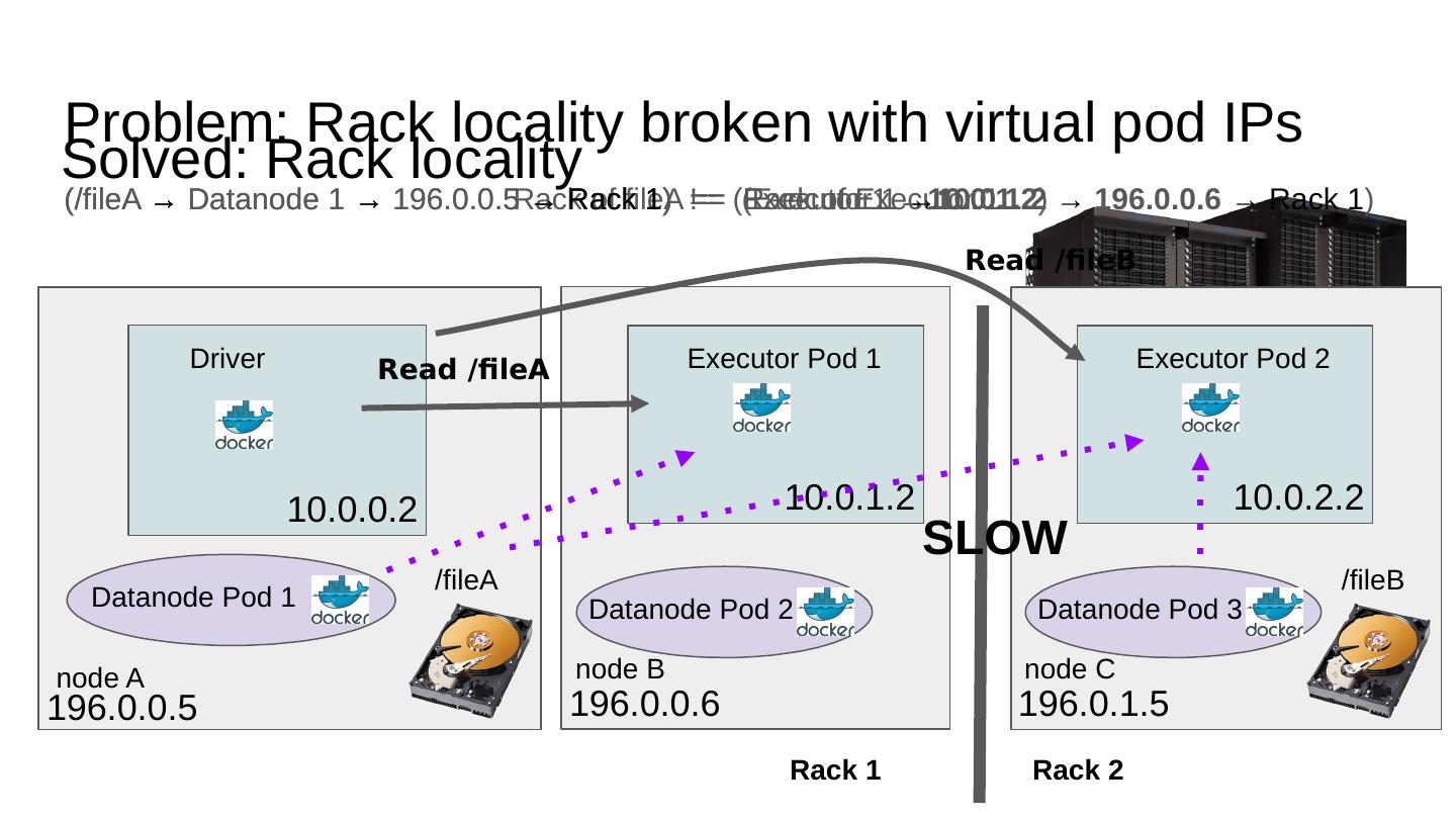 26 .Problem: Rack locality broken with virtual pod IPs Executor Pod 1 10.0.1.2 Driver 10.0.0.2 Read /fileA /fileA node A 196.0.0.5 node B 196.0.0.6 Datanode Pod 1 Datanode Pod 2 (/fileA → Datanode 1 → 196.0.0.5 → Rack 1 ) != (Executor 1 → 10.0.1.2 ) Executor Pod 2 10.0.2.2 Read /fileB /fileB node C 196.0.1.5 Datanode Pod 3 Rack 1 Rack 2 Rack of fileA == Rack of Executor 1 (/fileA → Datanode 1 → 196.0.0.5 → Rack 1 ) == (Executor 1 → 10.0.1.2 → 196.0.0.6 → Rack 1 ) SLOW Solved: Rack locality