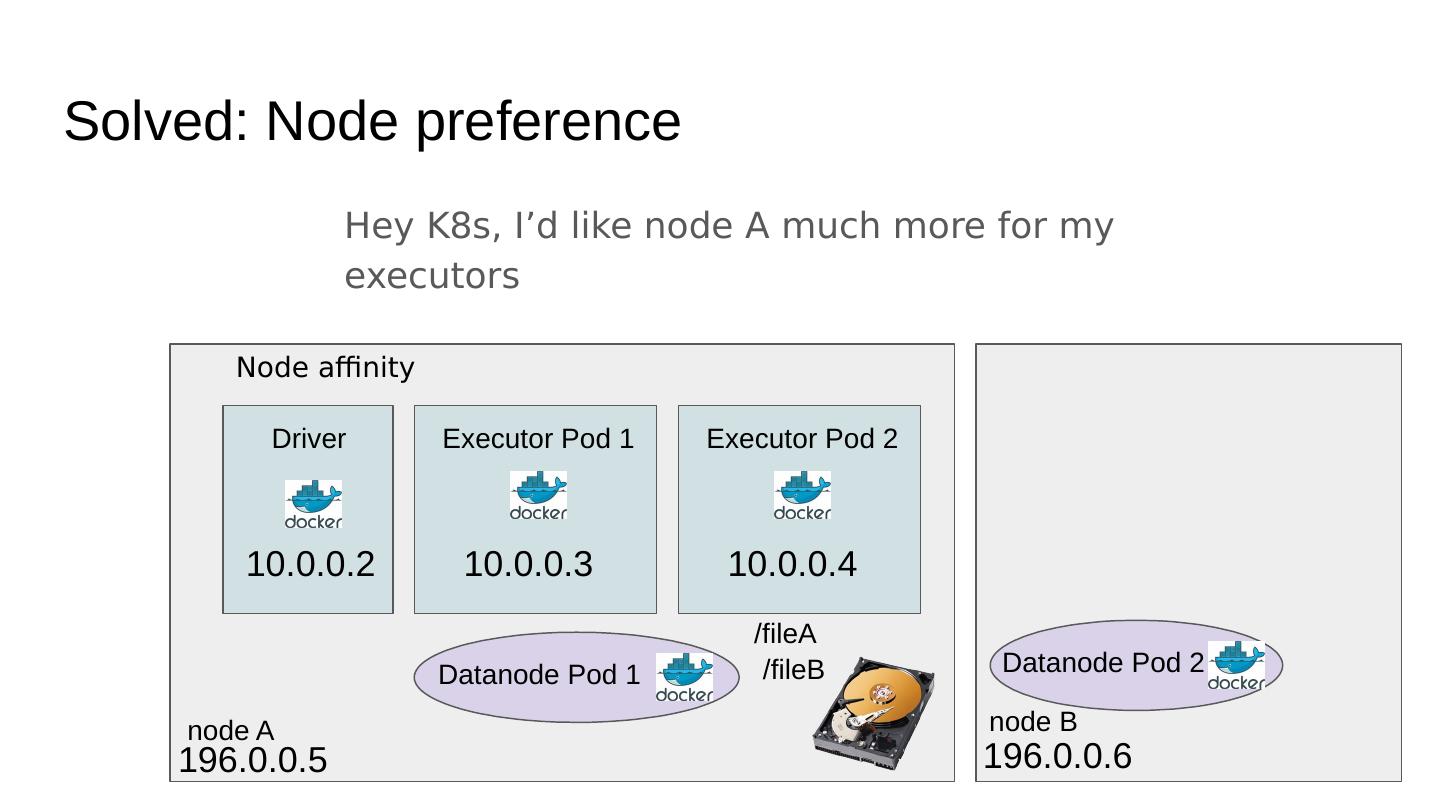 27 .Solved: Node preference Hey K8s, I’d like node A much more for my executors Driver Executor Pod 1 10.0.0.2 10.0.0.3 /fileA node A 196.0.0.5 node B 196.0.0.6 Datanode Pod 1 Datanode Pod 2 /fileB Executor Pod 2 10.0.0.4 Node affinity