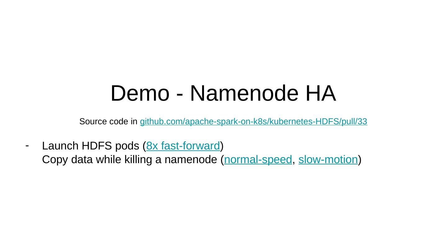 29 .Demo - Namenode HA Source code in github.com/apache-spark-on-k8s/kubernetes-HDFS/pull/33 Launch HDFS pods ( 8x fast-forward ) Copy data while killing a namenode ( normal-speed , slow-motion )
