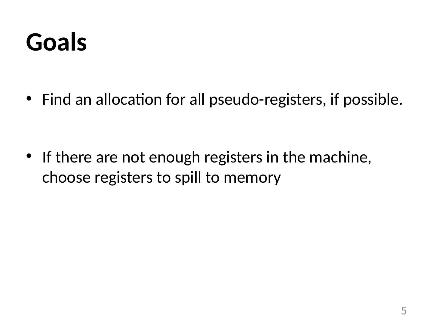 5 .Goals Find an allocation for all pseudo-registers, if possible. If there are not enough registers in the machine, choose registers to spill to memory 5