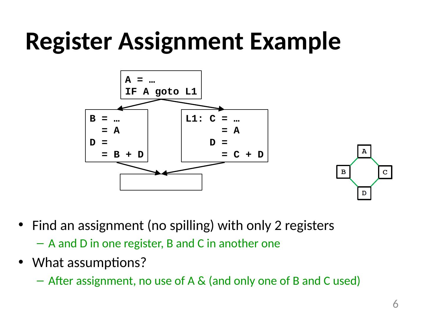 6 .Register Assignment Example 6 B = … = A D = = B + D L1: C = … = A D = = C + D A = … IF A goto L1 Find an assignment (no spilling) with only 2 registers A and D in one register, B and C in another one What assumptions? After assignment, no use of A & (and only one of B and C used)