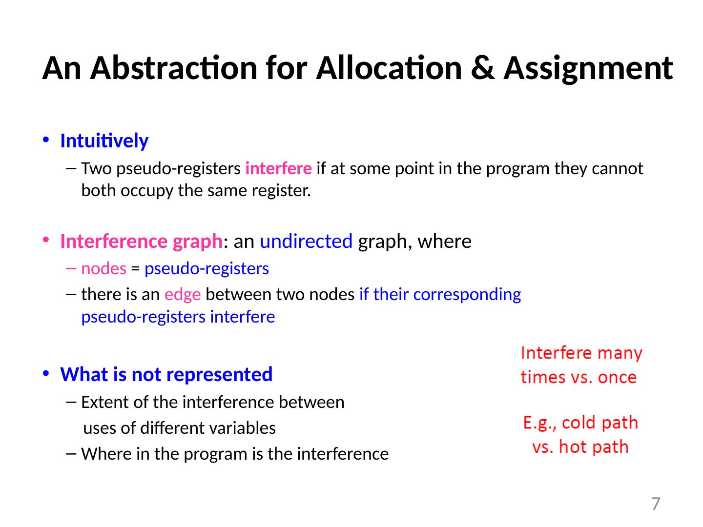 7 .An Abstraction for Allocation & Assignment Intuitively Two pseudo-registers interfere if at some point in the program they cannot both occupy the same register. Interference graph : an undirected graph, where nodes = pseudo-registers there is an edge between two nodes if their corresponding pseudo-registers interfere What is not represented Extent of the interference between uses of different variables Where in the program is the interference 7