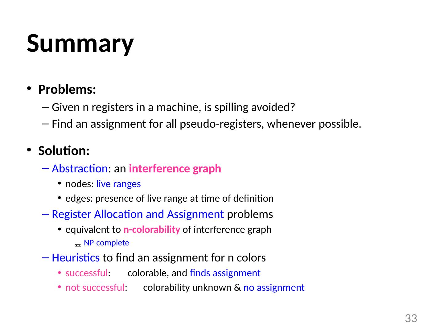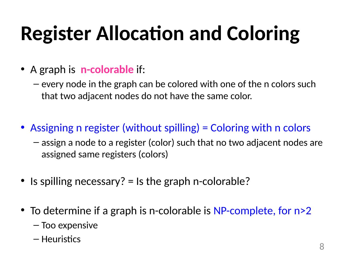 8 .Register Allocation and Coloring A graph is n-colorable if: every node in the graph can be colored with one of the n colors such that two adjacent nodes do not have the same color. Assigning n register (without spilling) = Coloring with n colors assign a node to a register (color) such that no two adjacent nodes are assigned same registers (colors) Is spilling necessary? = Is the graph n-colorable? To determine if a graph is n-colorable is NP-complete, for n>2 Too expensive Heuristics 8