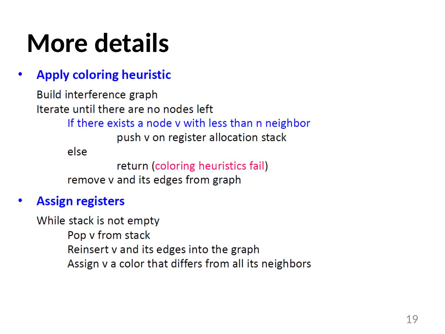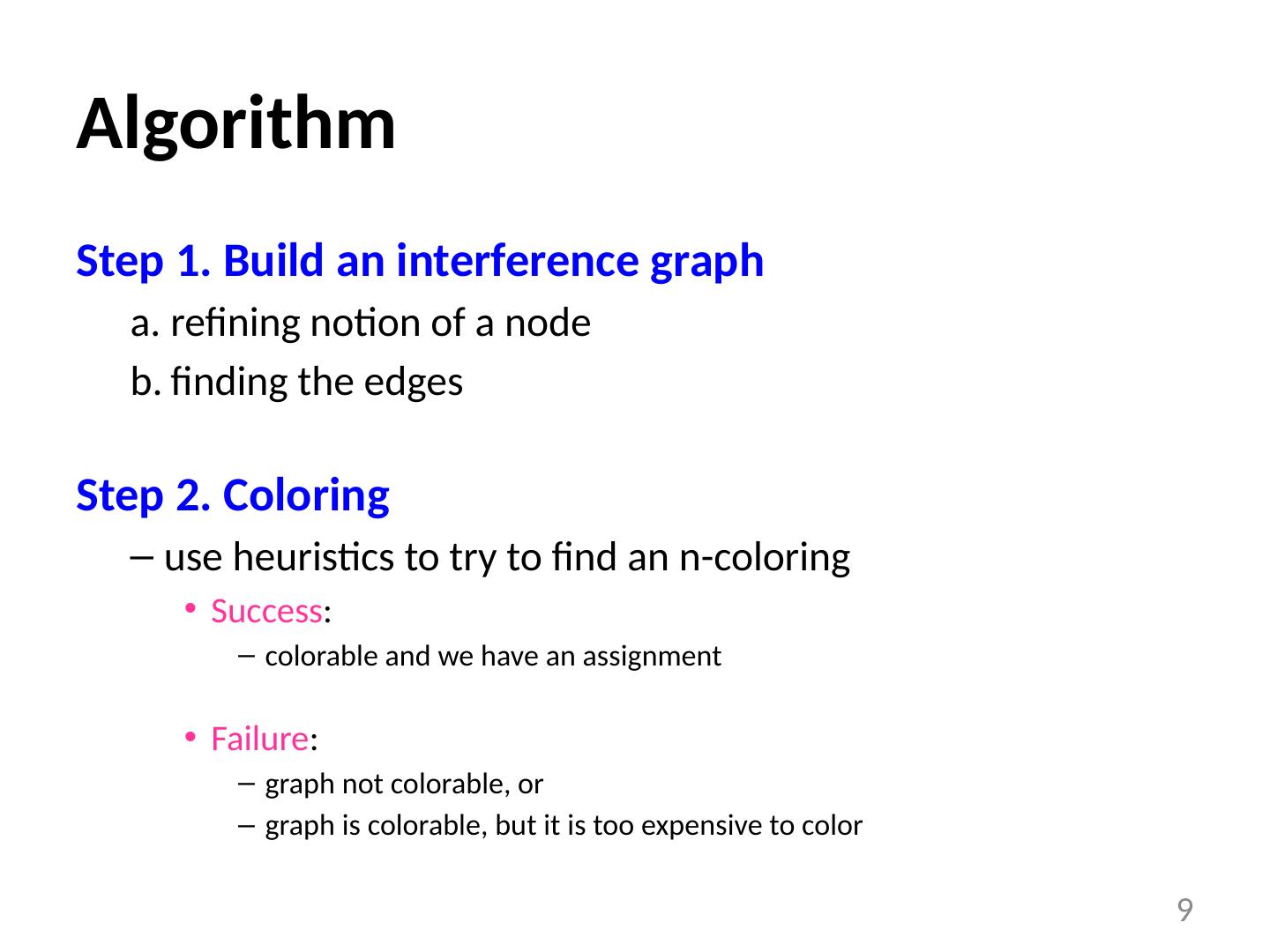9 .Algorithm Step 1. Build an interference graph refining notion of a node finding the edges Step 2. Coloring use heuristics to try to find an n-coloring Success : colorable and we have an assignment Failure : graph not colorable, or graph is colorable, but it is too expensive to color 9