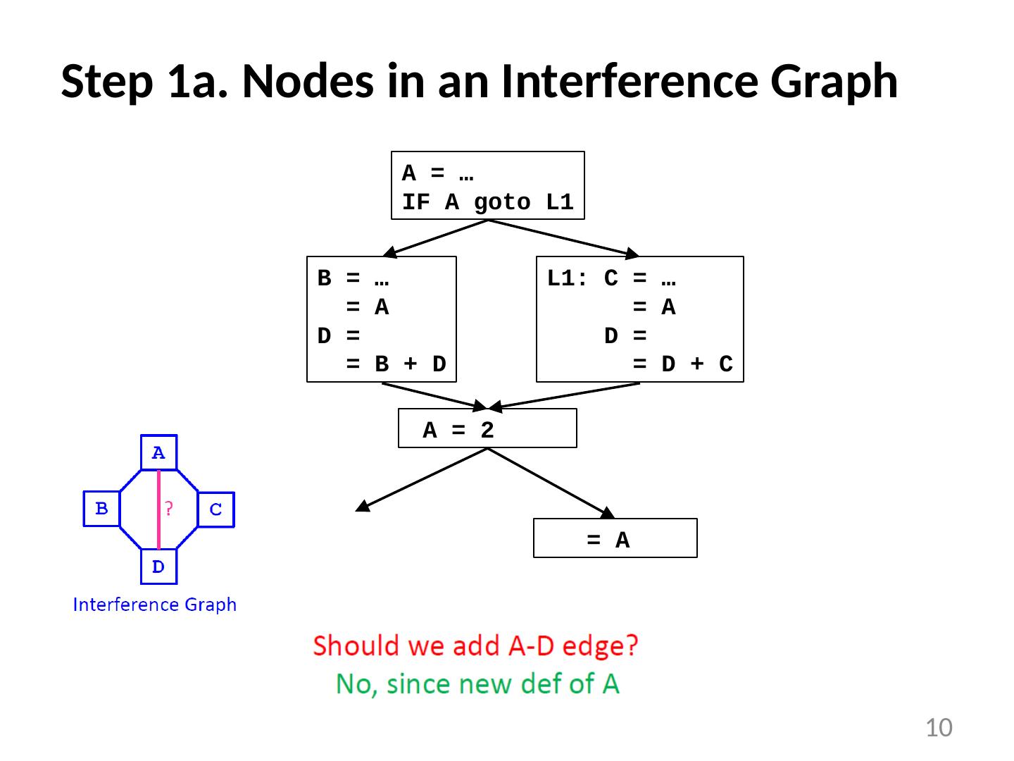 10 .Step 1a. Nodes in an Interference Graph 10 B = … = A D = = B + D L1: C = … = A D = = D + C A = … IF A goto L1 A = 2 = A
