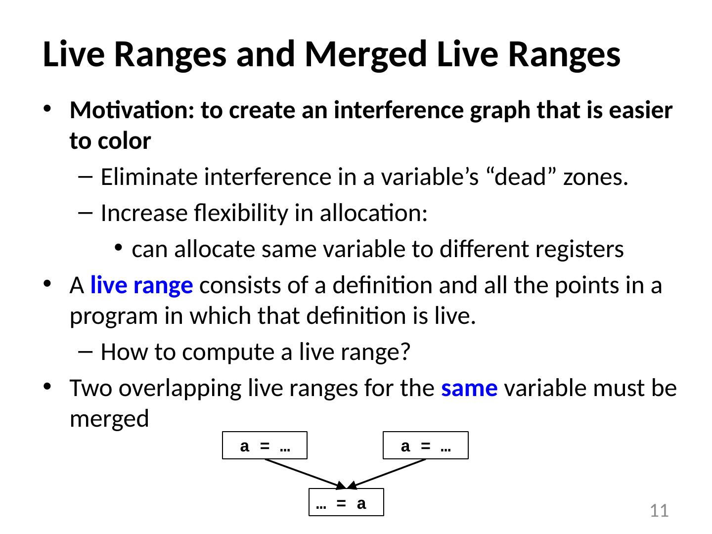 11 .Live Ranges and Merged Live Ranges Motivation: to create an interference graph that is easier to color Eliminate interference in a variable’s “dead” zones. Increase flexibility in allocation: can allocate same variable to different registers A live range consists of a definition and all the points in a program in which that definition is live. How to compute a live range? Two overlapping live ranges for the same variable must be merged 11 a = … a = … … = a
