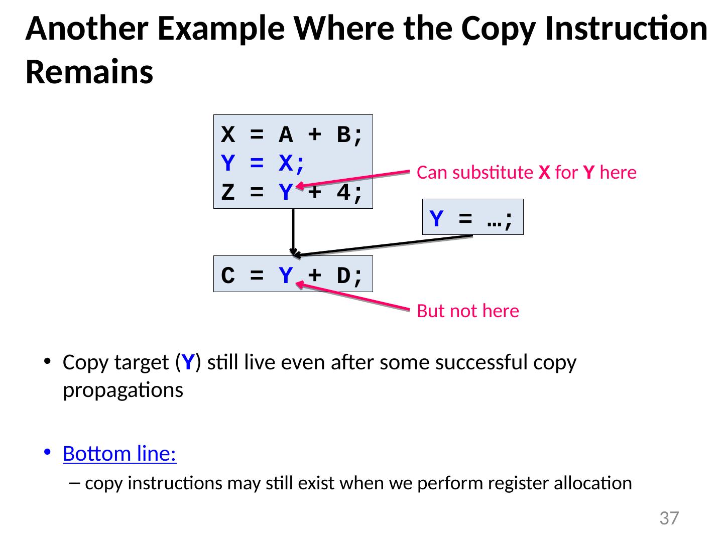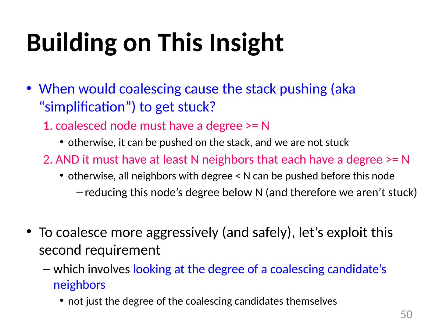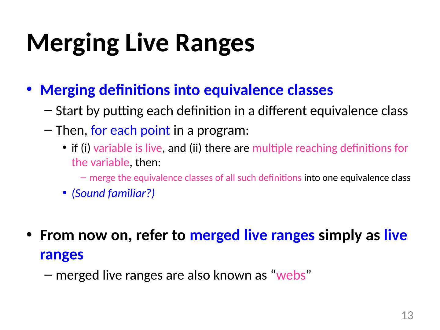 13 .Merging Live Ranges Merging definitions into equivalence classes Start by putting each definition in a different equivalence class Then, for each point in a program: if ( i ) variable is live , and (ii) there are multiple reaching definitions for the variable , then: merge the equivalence classes of all such definitions into one equivalence class (Sound familiar?) From now on, refer to merged live ranges simply as live ranges merged live ranges are also known as “ webs ” 13