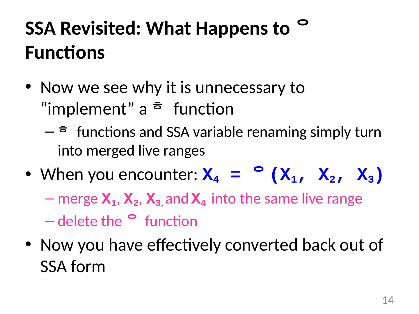 14 .SSA Revisited: What Happens to Functions Now we see why it is unnecessary to “implement” a function functions and SSA variable renaming simply turn into merged live ranges When you encounter: X 4 = (X 1 , X 2 , X 3 ) merge X 1 , X 2 , X 3 , and X 4 into the same live range delete the function Now you have effectively converted back out of SSA form 14
