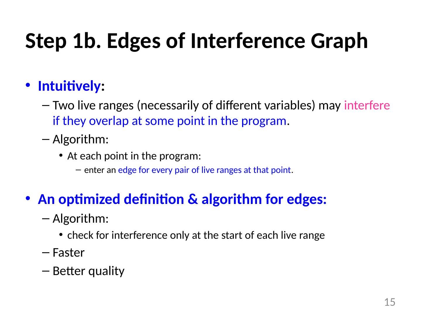 15 .Step 1b. Edges of Interference Graph Intuitively : Two live ranges (necessarily of different variables) may interfere if they overlap at some point in the program . Algorithm: At each point in the program: enter an edge for every pair of live ranges at that point . An optimized definition & algorithm for edges: Algorithm: check for interference only at the start of each live range Faster Better quality 15