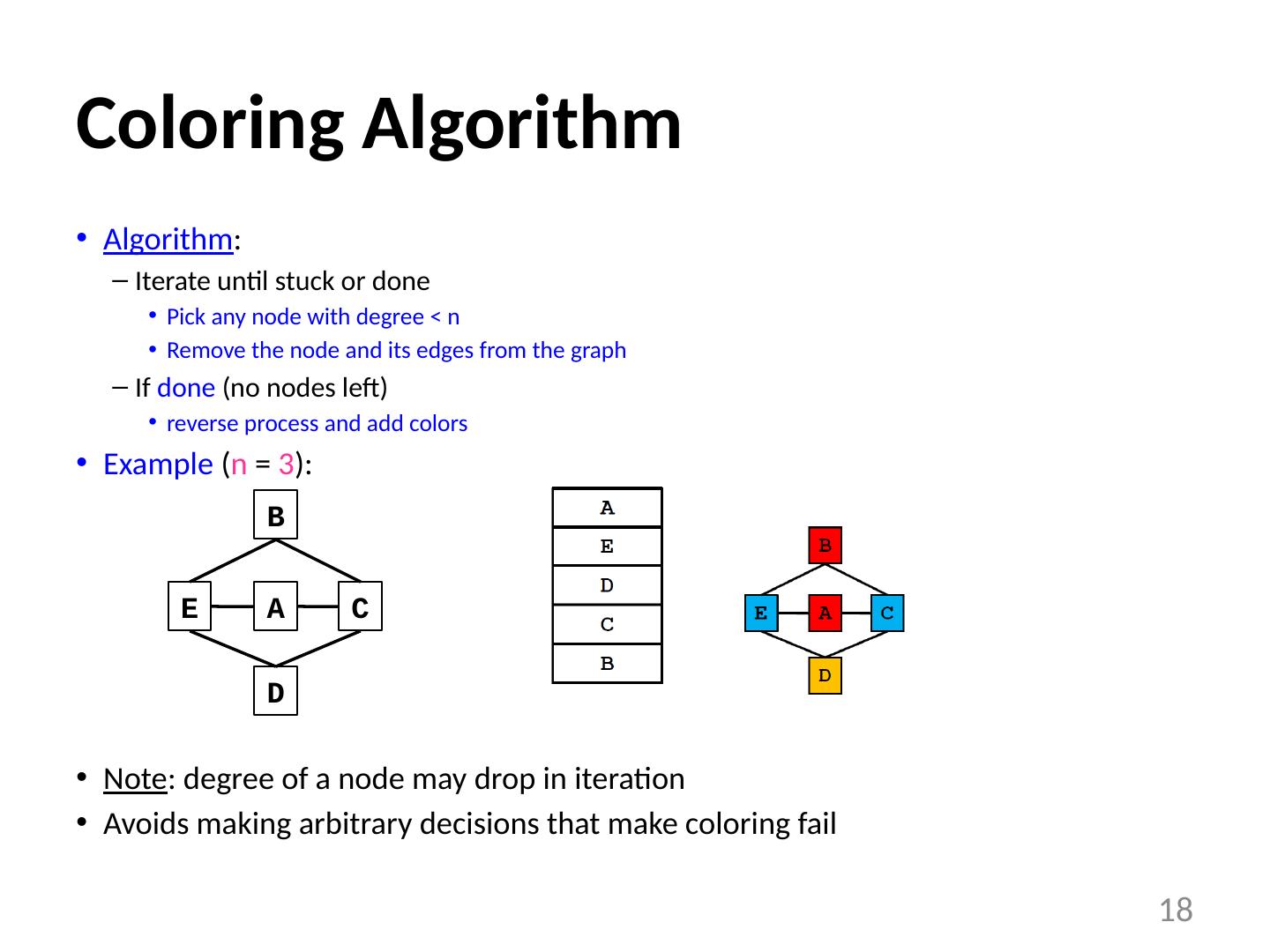 18 .Coloring Algorithm Algorithm : Iterate until stuck or done Pick any node with degree < n Remove the node and its edges from the graph If done (no nodes left) reverse process and add colors Example ( n = 3 ): Note : degree of a node may drop in iteration Avoids making arbitrary decisions that make coloring fail 18 B C E A D