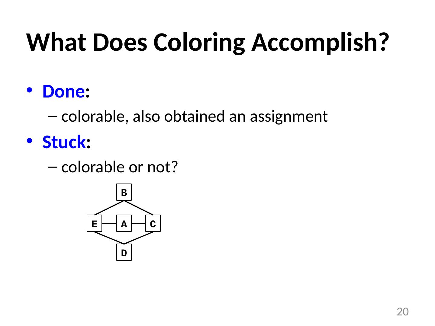 20 .What Does Coloring Accomplish? Done : colorable, also obtained an assignment Stuck : colorable or not? 20 B C E A D
