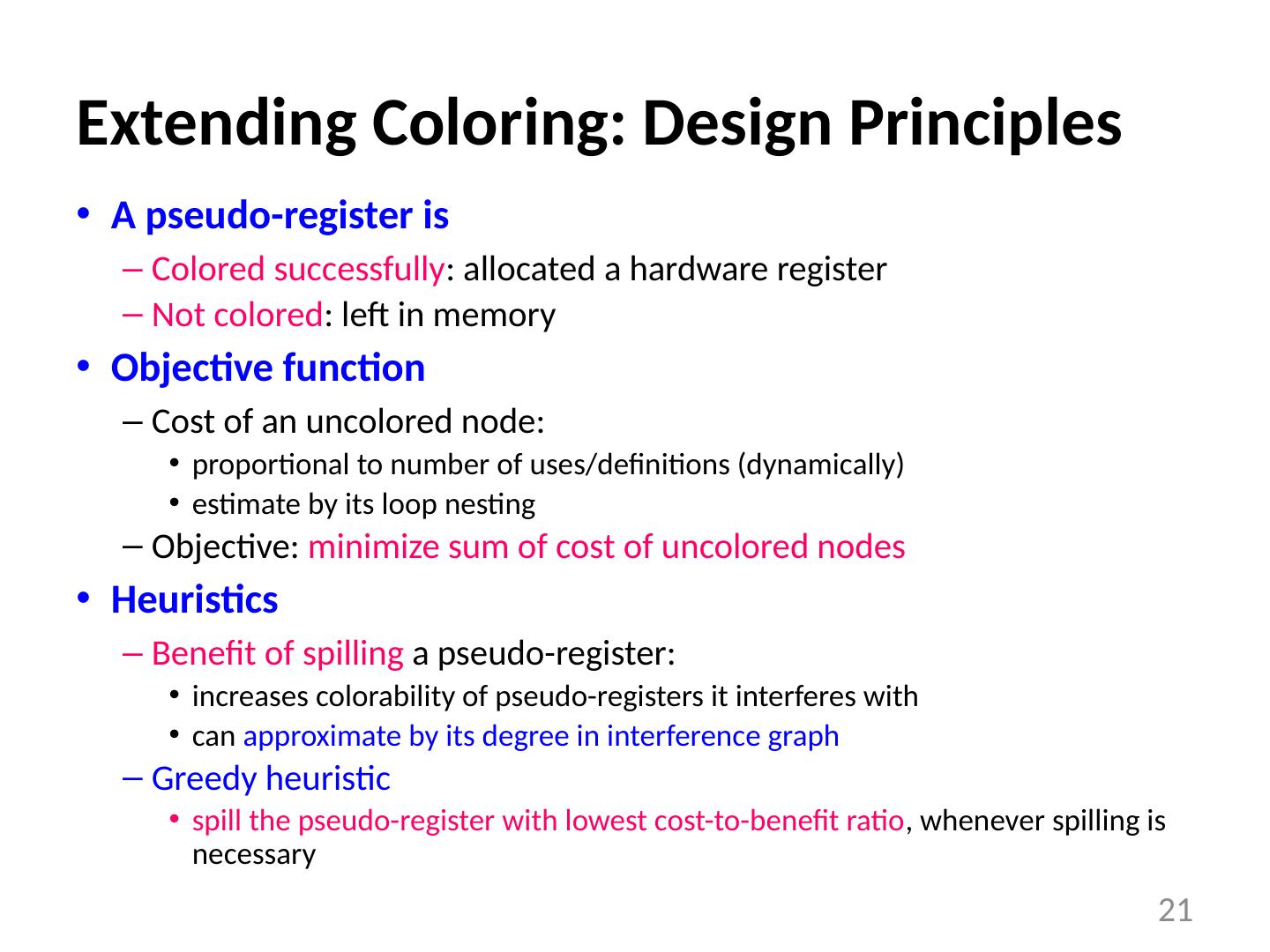21 .Extending Coloring: Design Principles A pseudo-register is Colored successfully : allocated a hardware register Not colored : left in memory Objective function Cost of an uncolored node: proportional to number of uses/definitions (dynamically) estimate by its loop nesting Objective: minimize sum of cost of uncolored nodes Heuristics Benefit of spilling a pseudo-register: increases colorability of pseudo-registers it interferes with can approximate by its degree in interference graph Greedy heuristic spill the pseudo-register with lowest cost-to-benefit ratio , whenever spilling is necessary 21