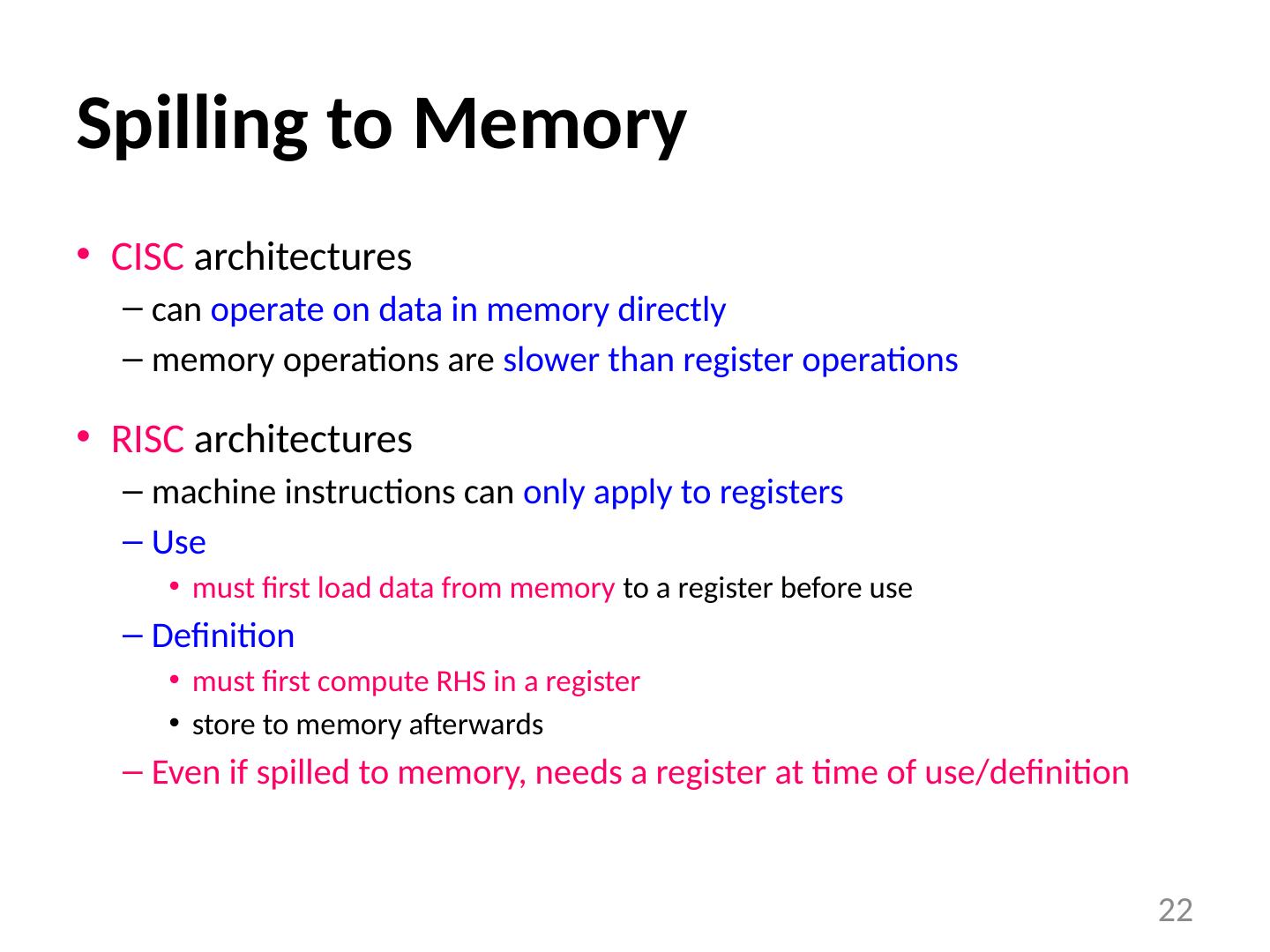 22 .Spilling to Memory CISC architectures can operate on data in memory directly memory operations are slower than register operations RISC architectures machine instructions can only apply to registers Use must first load data from memory to a register before use Definition must first compute RHS in a register store to memory afterwards Even if spilled to memory, needs a register at time of use/definition 22