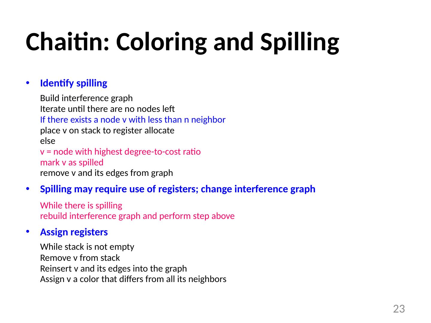 23 .23 Chaitin: Coloring and Spilling Identify spilling Build interference graph Iterate until there are no nodes left If there exists a node v with less than n neighbor place v on stack to register allocate else v = node with highest degree-to-cost ratio mark v as spilled remove v and its edges from graph Spilling may require use of registers; change interference graph While there is spilling rebuild interference graph and perform step above Assign registers While stack is not empty Remove v from stack Reinsert v and its edges into the graph Assign v a color that differs from all its neighbors