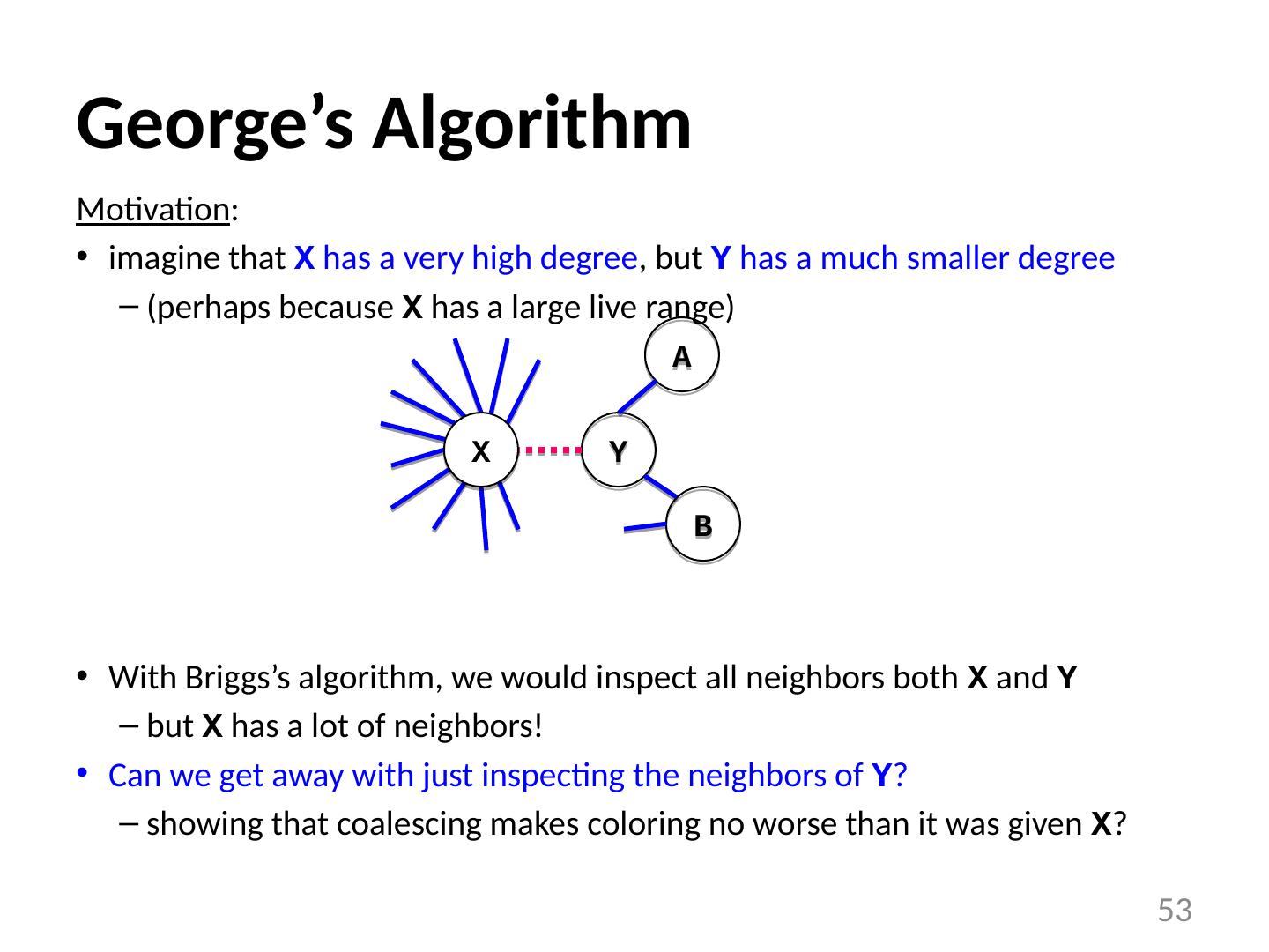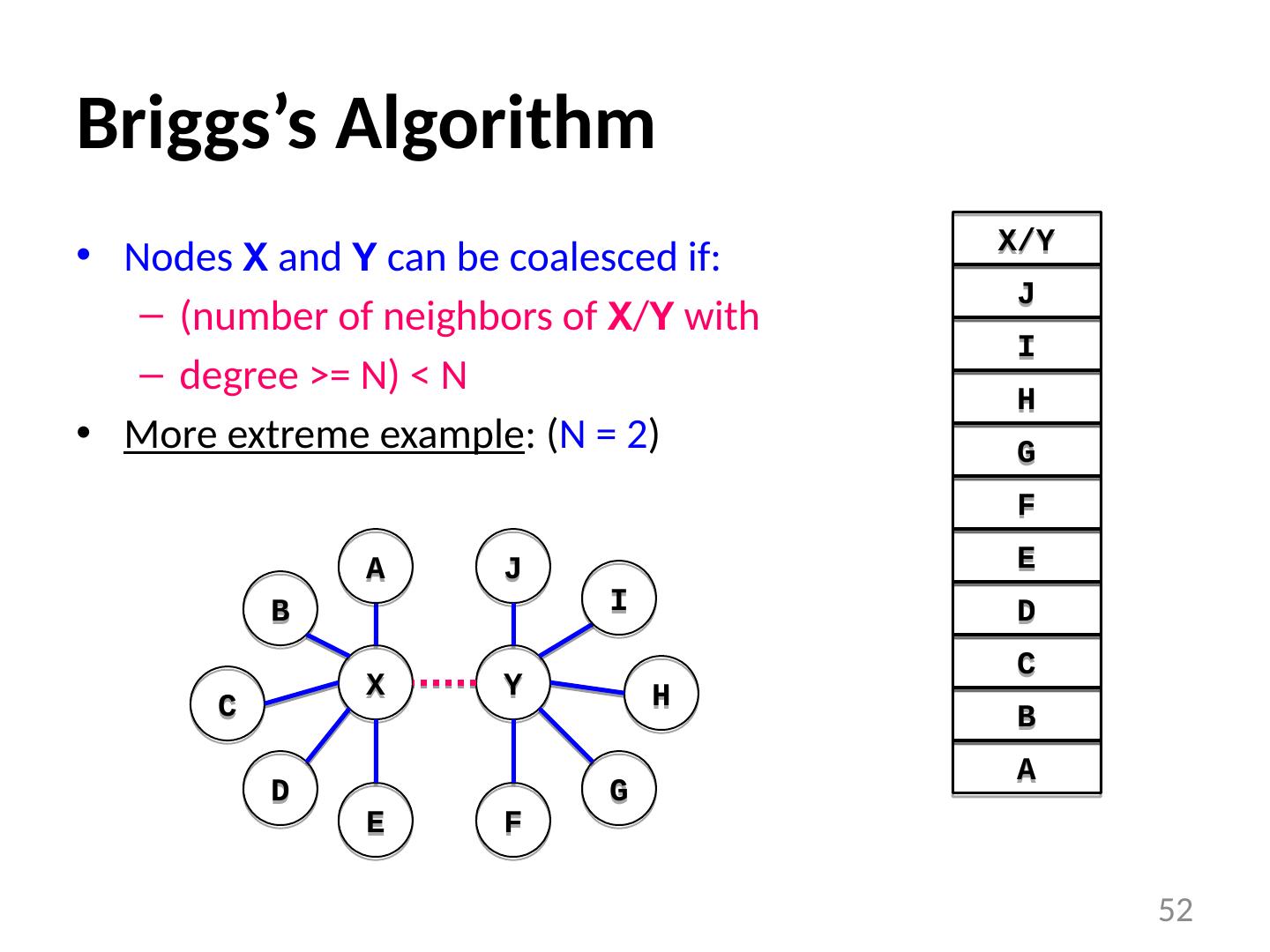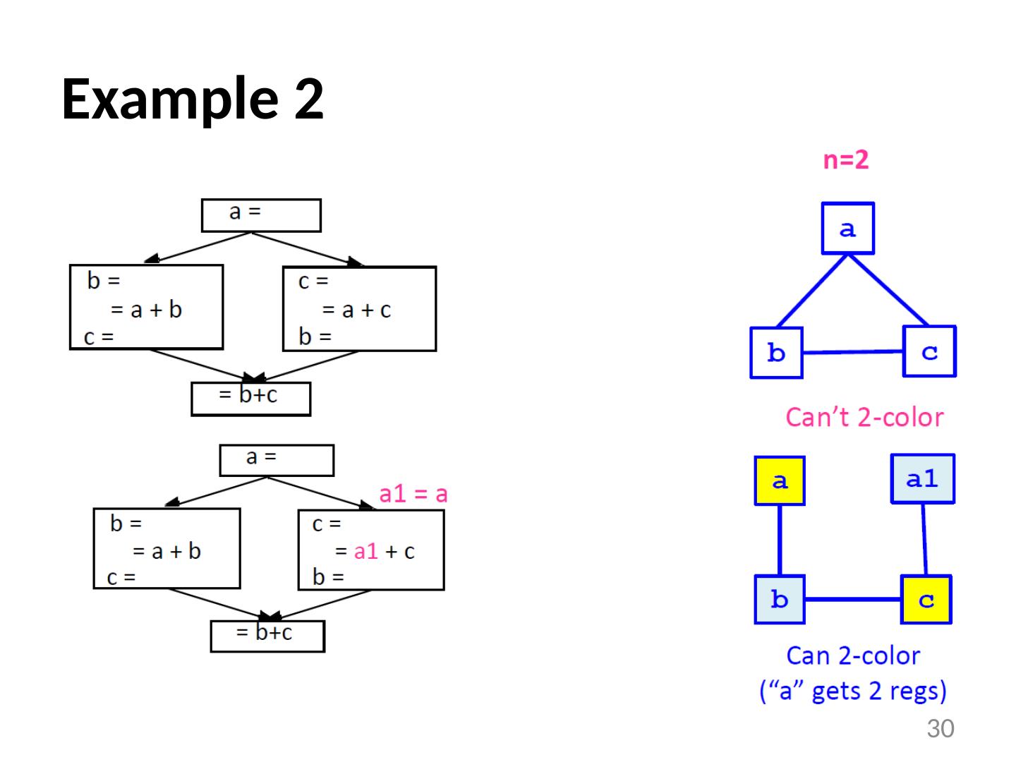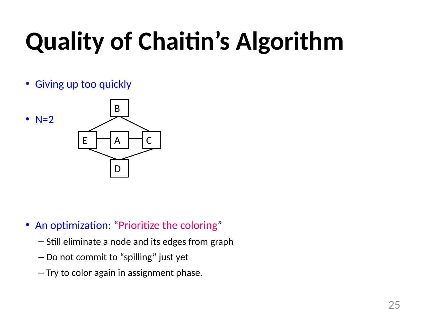 25 .Quality of Chaitin’s Algorithm Giving up too quickly N=2 An optimization : “ Prioritize the coloring ” Still eliminate a node and its edges from graph Do not commit to “spilling” just yet Try to color again in assignment phase. 25 B A C D E