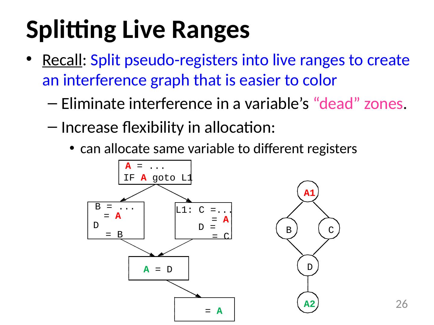 26 .Splitting Live Ranges Recall : Split pseudo-registers into live ranges to create an interference graph that is easier to color Eliminate interference in a variable’s “dead” zones . Increase flexibility in allocation: can allocate same variable to different registers 26 IF A goto L1 A = ... B = ... L1: C =... = A D = A D = A = D = A A1 C B D A2 = B = C