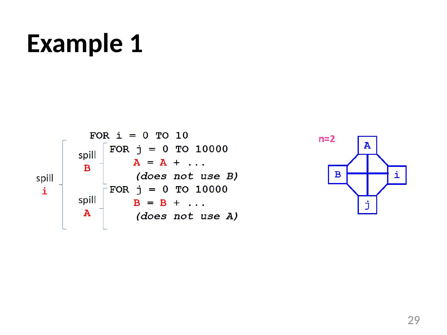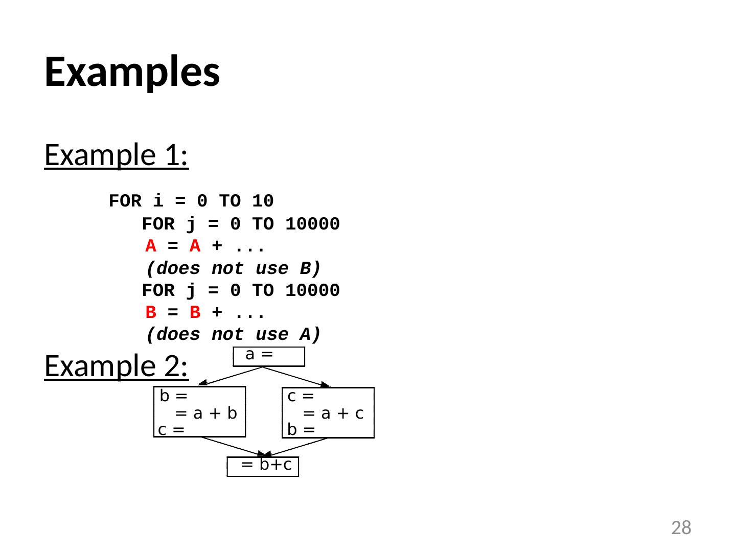 28 .28 Examples Example 1: FOR i = 0 TO 10 FOR j = 0 TO 10000 A = A + ... (does not use B) FOR j = 0 TO 10000 B = B + ... (does not use A) Example 2: a = b = = a + b c = = b+c b = c = = a + c