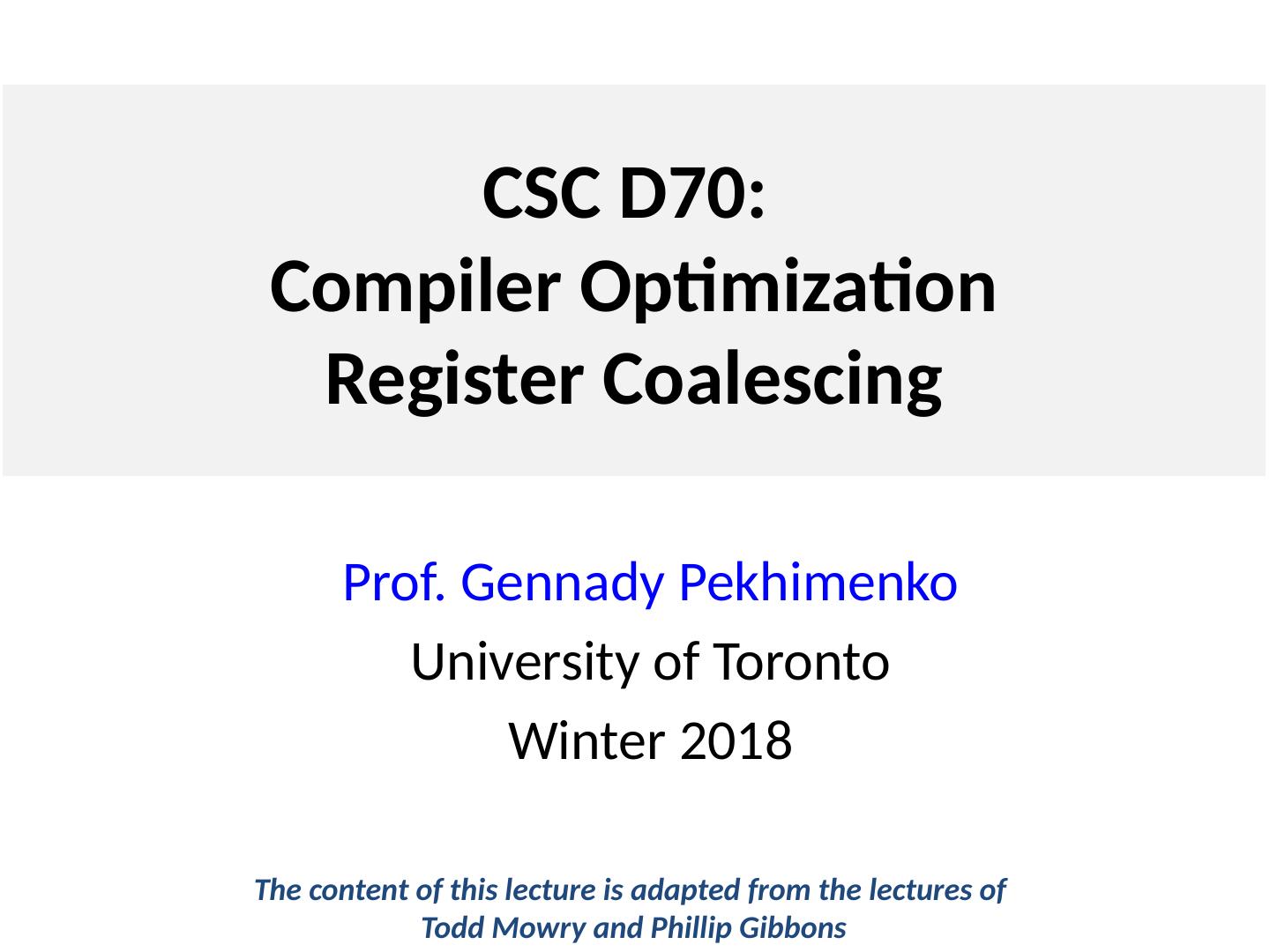 1 .CSC D70: Compiler Optimization Register Allocation Prof. Gennady Pekhimenko University of Toronto Winter 2018 The content of this lecture is adapted from the lectures of Todd Mowry and Phillip Gibbons