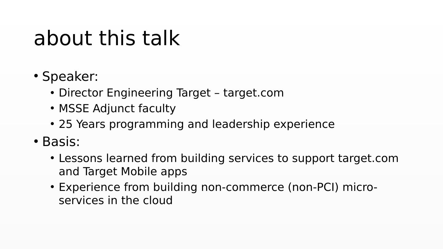 2 .a bout this talk Speaker: Director Engineering Target – target.com MSSE Adjunct faculty 25 Years programming and leadership experience Basis: Lessons learned from building services to support target.com and Target Mobile apps Experience from building non-commerce (non-PCI) micro-services in the cloud