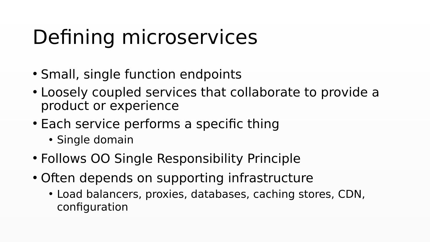 3 .Defining m icroservices Small, single function endpoints Loosely coupled services that collaborate to provide a product or experience Each service performs a specific thing Single domain Follows OO Single Responsibility Principle Often depends on supporting infrastructure Load balancers, proxies, databases, caching stores, CDN, configuration