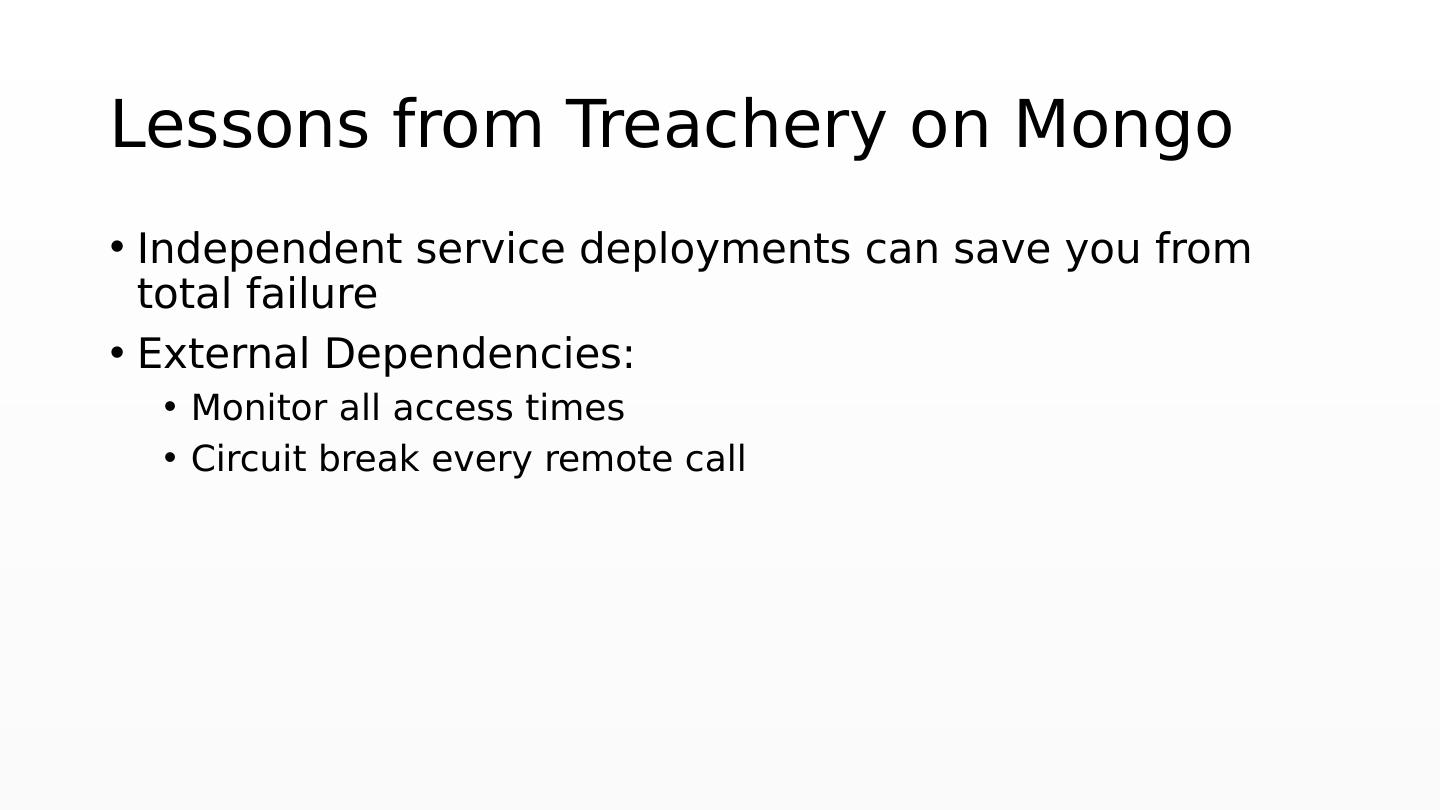 6 .Lessons from Treachery on Mongo Independent service deployments can save you from total failure External Dependencies: Monitor all access times Circuit break every remote call