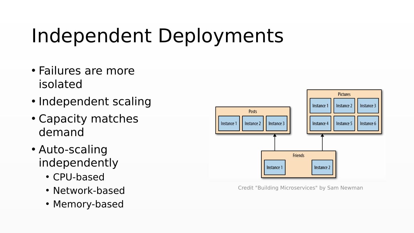 7 .Independent Deployments Failures are more isolated Independent scaling Capacity matches demand Auto-scaling independently CPU-based Network-based Memory-based Credit "Building Microservices " by Sam Newman