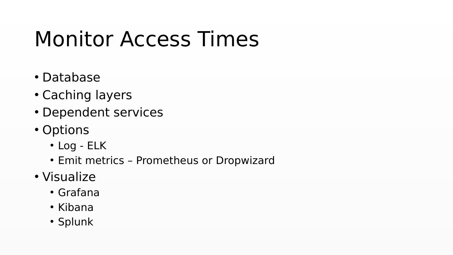 8 .Monitor Access Times Database Caching layers Dependent services Options Log - ELK Emit metrics – Prometheus or Dropwizard Visualize Grafana Kibana Splunk