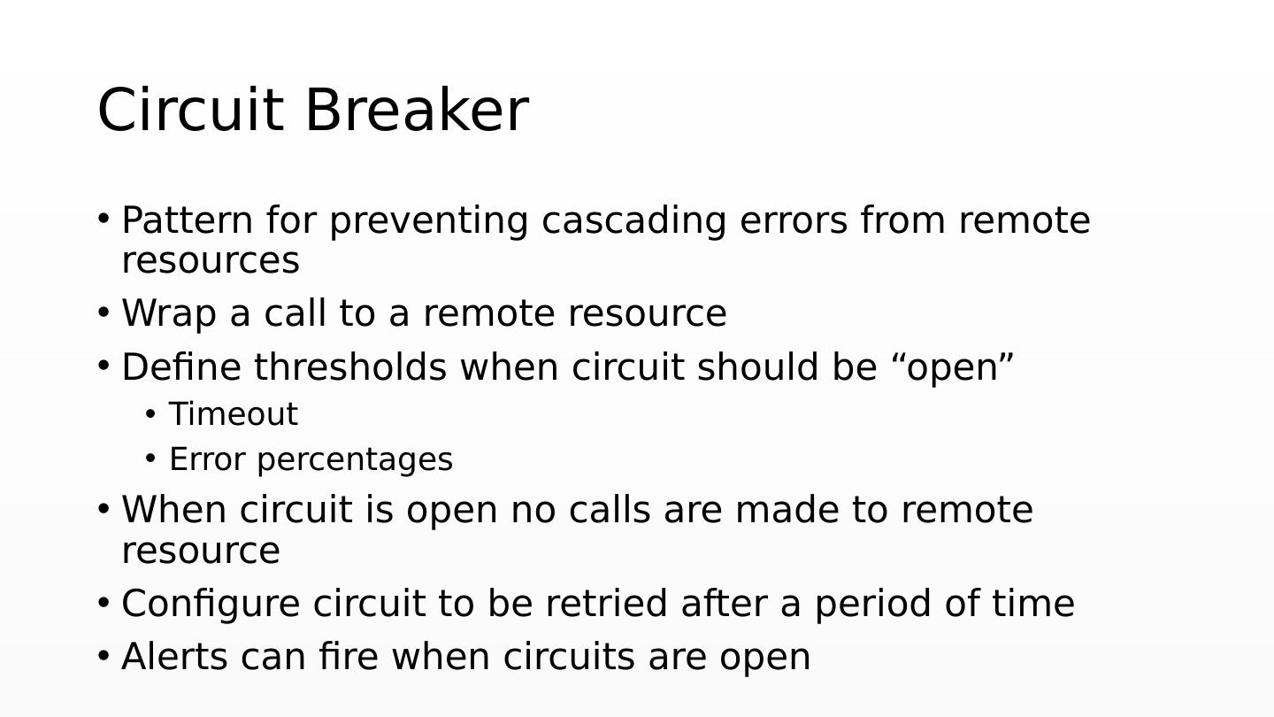 9 .Circuit Breaker Pattern for preventing cascading errors from remote resources Wrap a call to a remote resource Define thresholds when circuit should be “open” Timeout Error percentages When circuit is open no calls are made to remote resource Configure circuit to be retried after a period of time Alerts can fire when circuits are open