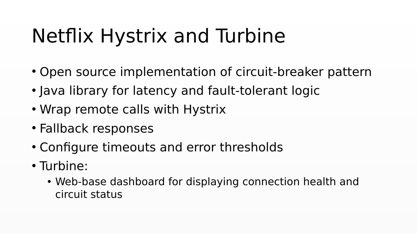 10 .Netflix Hystrix and Turbine Open source implementation of circuit-breaker pattern Java library for latency and fault-tolerant logic Wrap remote calls with Hystrix Fallback responses Configure timeouts and error thresholds Turbine: Web-base dashboard for displaying connection health and circuit status