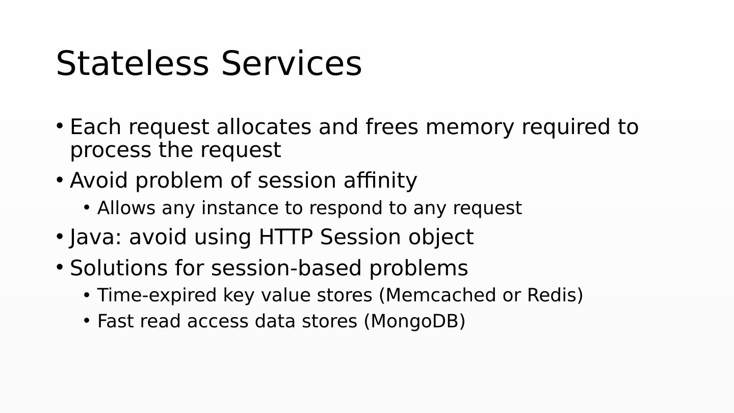 13 .Stateless Services Each request allocates and frees memory required to process the request Avoid problem of session affinity Allows any instance to respond to any request Java: avoid using HTTP Session object Solutions for session-based problems Time-expired key value stores ( Memcached or Redis ) Fast read access data stores ( MongoDB )