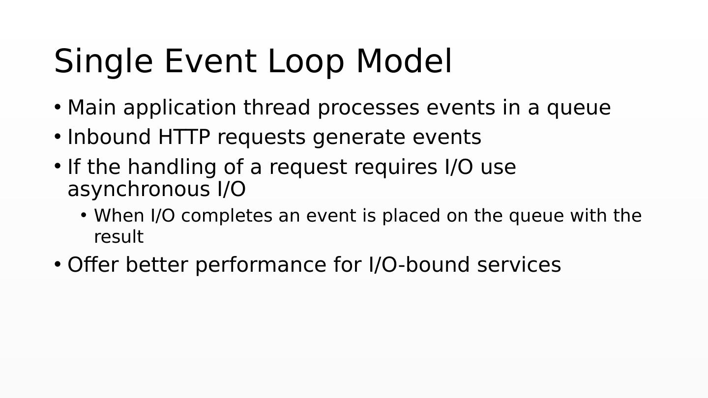 16 .Single Event Loop Model Main application thread processes events in a queue Inbound HTTP requests generate events If the handling of a request requires I/O use asynchronous I/O When I/O completes an event is placed on the queue with the result Offer better performance for I/O-bound services