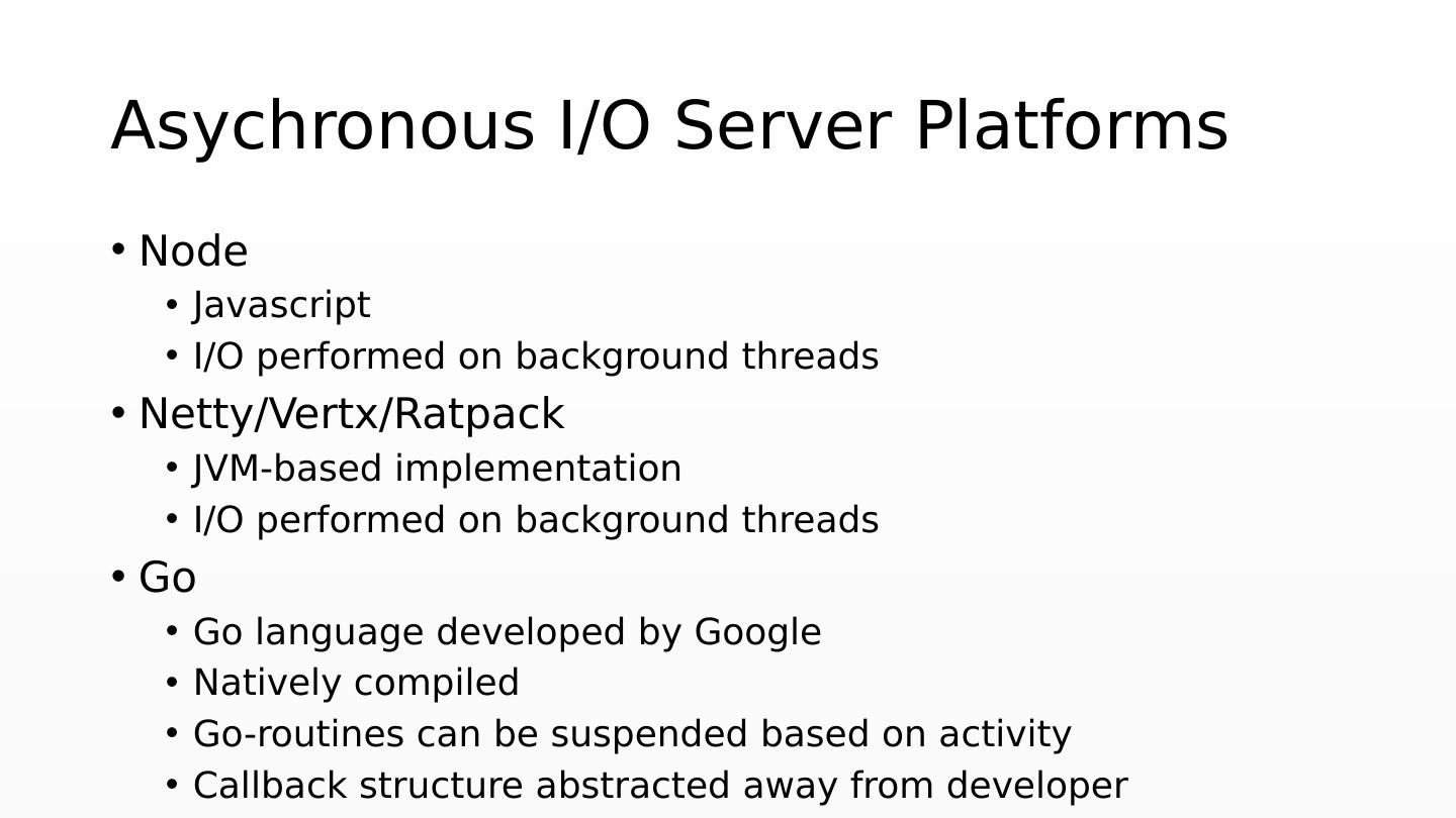 18 .Asychronous I/O Server Platforms Node Javascript I/O performed on background threads Netty / Vertx / Ratpack JVM-based implementation I/O performed on background threads Go Go language developed by Google Natively compiled Go-routines can be suspended based on activity Callback structure abstracted away from developer