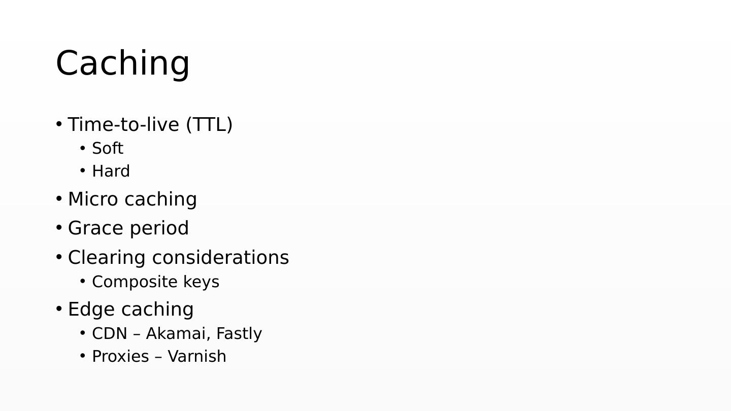 19 .Caching Time-to-live (TTL) Soft Hard Micro caching Grace period Clearing considerations Composite keys Edge caching CDN – Akamai, Fastly Proxies – Varnish
