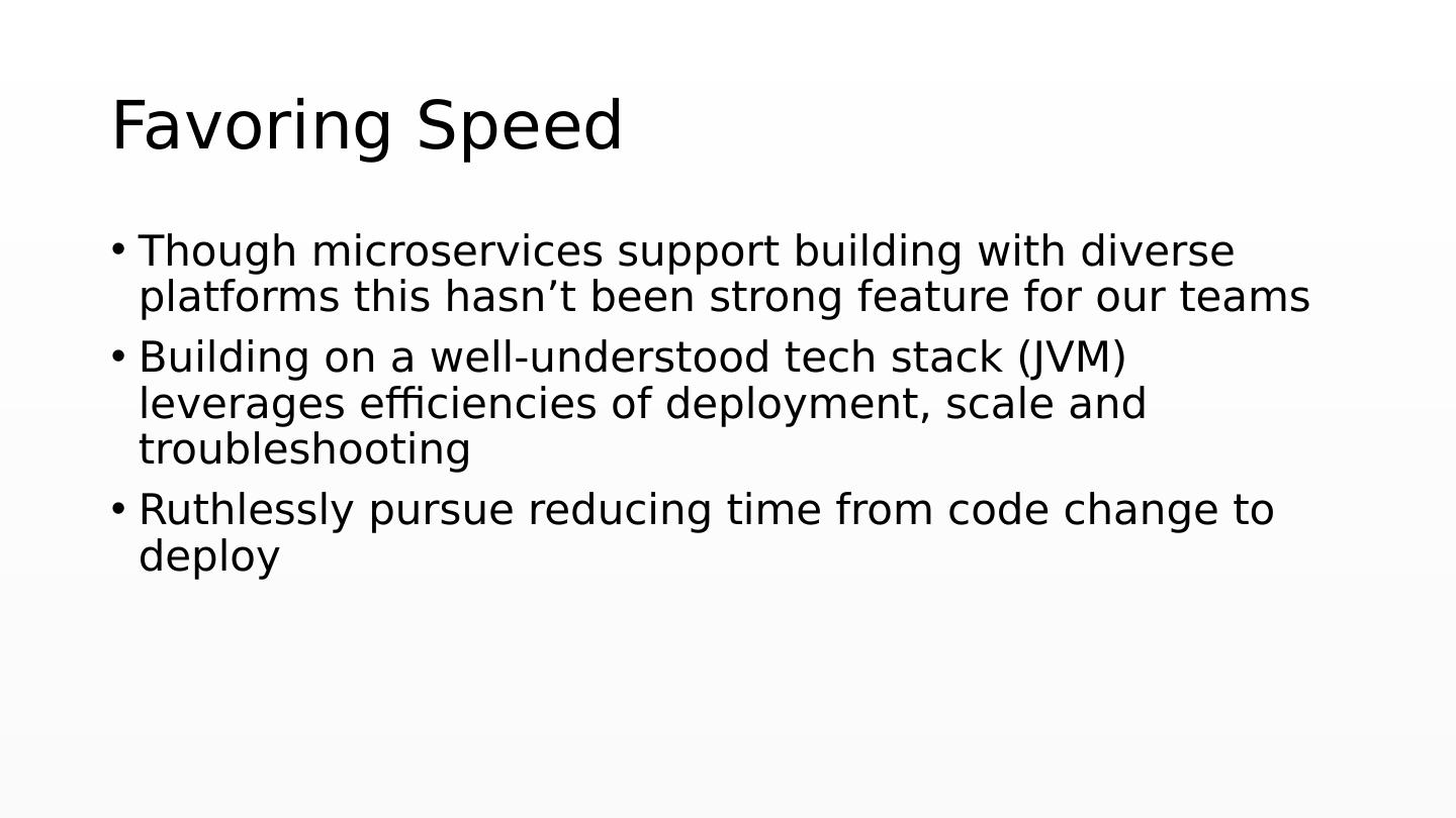 21 .Favoring Speed Though microservices support building with diverse platforms this hasn’t been strong feature for our teams Building on a well-understood tech stack (JVM) leverages efficiencies of deployment, scale and troubleshooting Ruthlessly pursue reducing time from code change to deploy