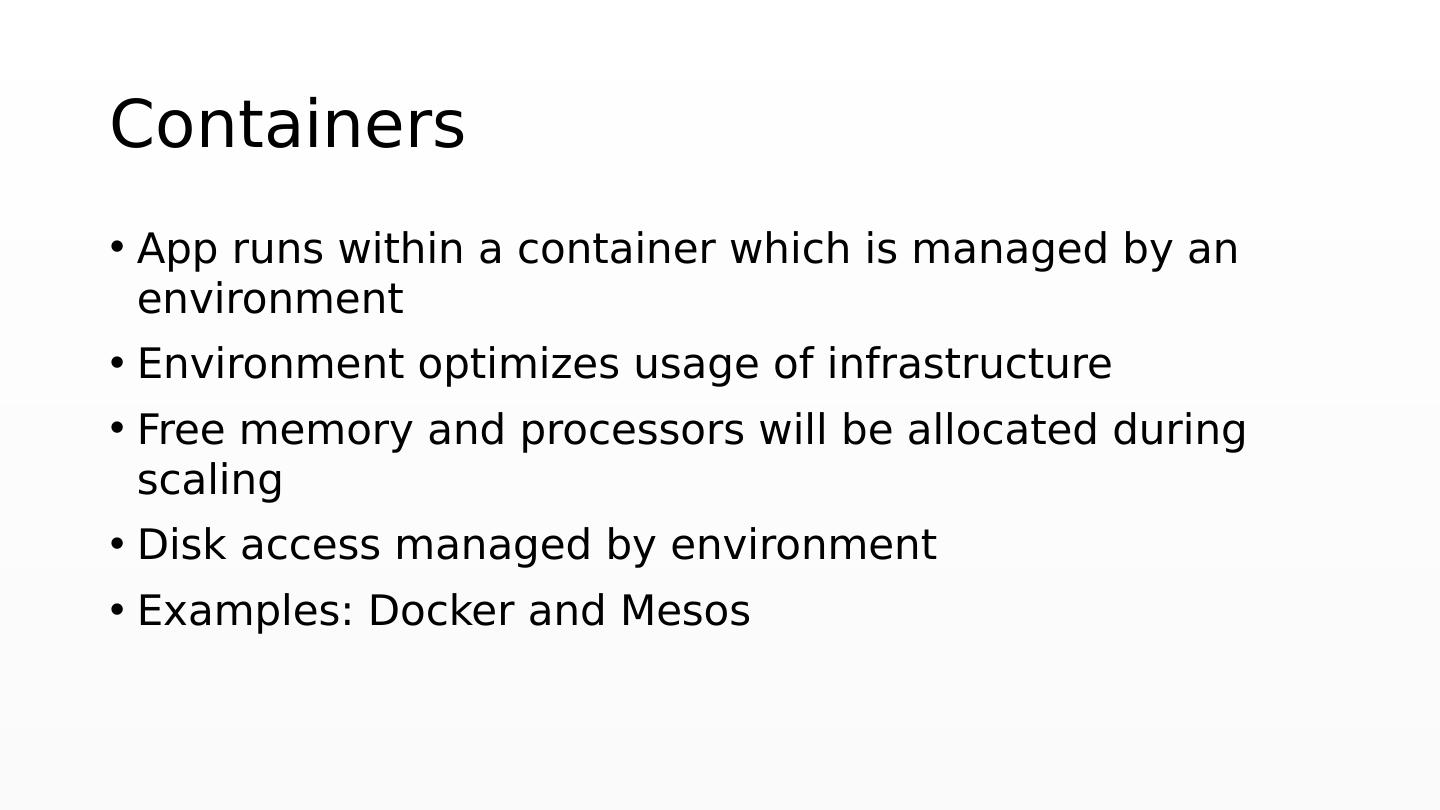 24 .Containers App runs within a container which is managed by an environment Environment optimizes usage of infrastructure Free memory and processors will be allocated during scaling Disk access managed by environment Examples: Docker and Mesos