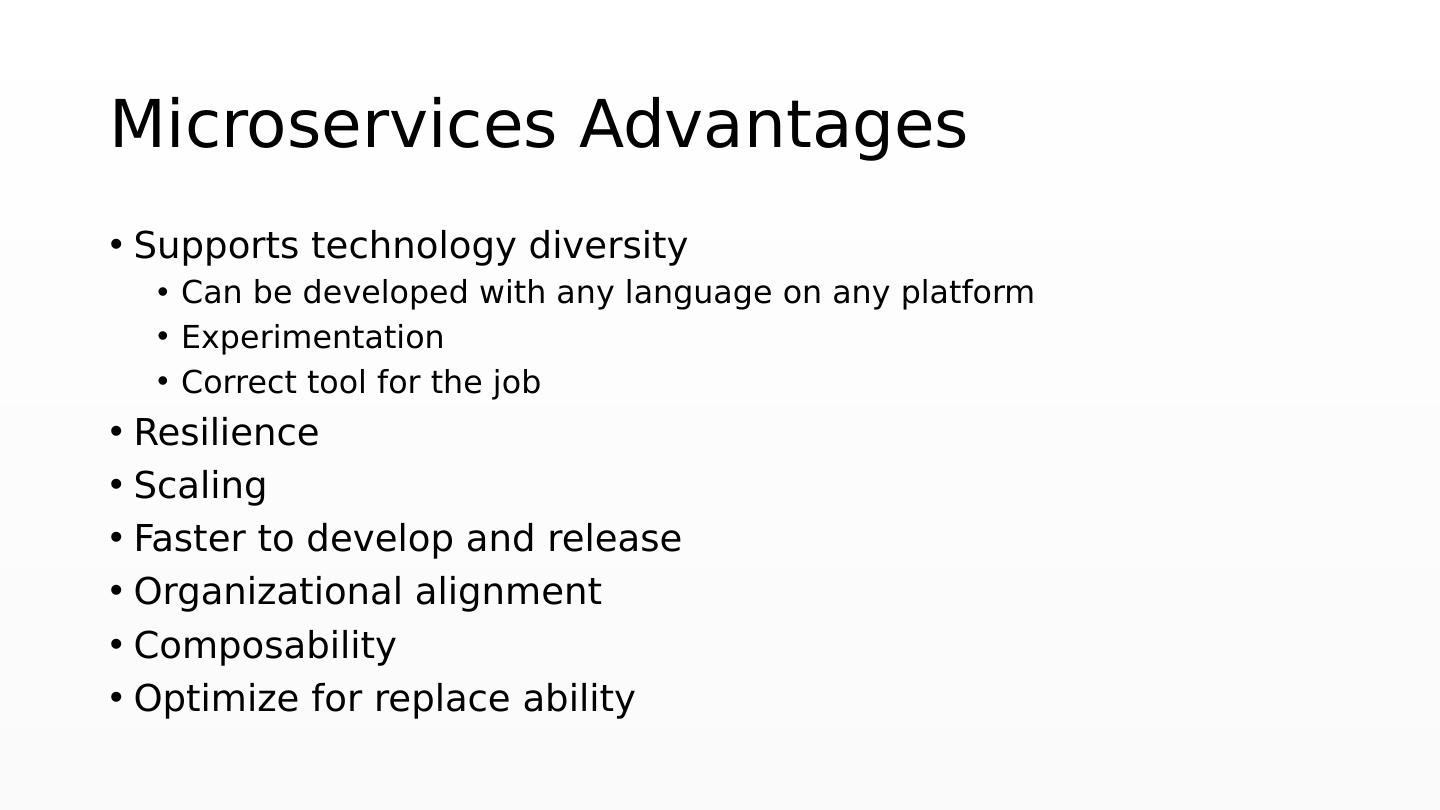 27 .Microservices Advantages Supports technology diversity Can be developed with any language on any platform Experimentation Correct tool for the job Resilience Scaling Faster to develop and release Organizational alignment Composability Optimize for replace ability