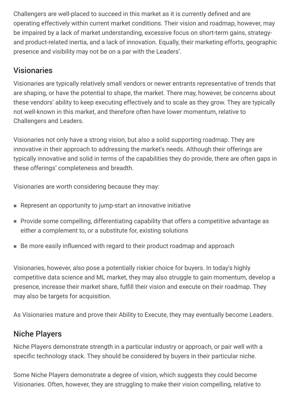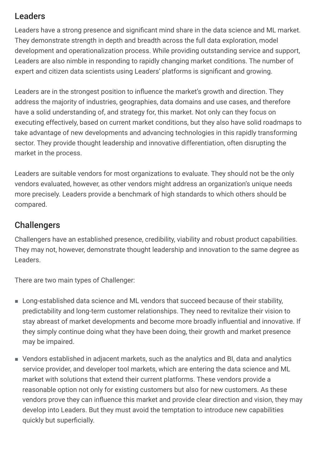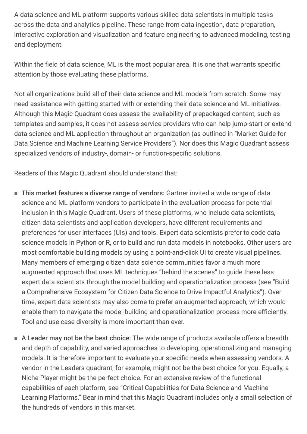 2 .A data science and ML platform supports various skilled data scientists in multiple tasks across the data and analytics pipeline. These range from data ingestion, data preparation, interactive exploration and visualization and feature engineering to advanced modeling, testing and deployment. Within the field of data science, ML is the most popular area. It is one that warrants specific attention by those evaluating these platforms. Not all organizations build all of their data science and ML models from scratch. Some may need assistance with getting started with or extending their data science and ML initiatives. Although this Magic Quadrant does assess the availability of prepackaged content, such as templates and samples, it does not assess service providers who can help jump-start or extend data science and ML application throughout an organization (as outlined in “Market Guide for Data Science and Machine Learning Service Providers”). Nor does this Magic Quadrant assess specialized vendors of industry-, domain- or function-specific solutions. Readers of this Magic Quadrant should understand that: ■ This market features a diverse range of vendors: Gartner invited a wide range of data science and ML platform vendors to participate in the evaluation process for potential inclusion in this Magic Quadrant. Users of these platforms, who include data scientists, citizen data scientists and application developers, have different requirements and preferences for user interfaces (UIs) and tools. Expert data scientists prefer to code data science models in Python or R, or to build and run data models in notebooks. Other users are most comfortable building models by using a point-and-click UI to create visual pipelines. Many members of emerging citizen data science communities favor a much more augmented approach that uses ML techniques “behind the scenes” to guide these less expert data scientists through the model building and operationalization process (see “Build a Comprehensive Ecosystem for Citizen Data Science to Drive Impactful Analytics”). Over time, expert data scientists may also come to prefer an augmented approach, which would enable them to navigate the model-building and operationalization process more efficiently. Tool and use case diversity is more important than ever. ■ A Leader may not be the best choice: The wide range of products available offers a breadth and depth of capability, and varied approaches to developing, operationalizing and managing models. It is therefore important to evaluate your specific needs when assessing vendors. A vendor in the Leaders quadrant, for example, might not be the best choice for you. Equally, a Niche Player might be the perfect choice. For an extensive review of the functional capabilities of each platform, see “Critical Capabilities for Data Science and Machine Learning Platforms.” Bear in mind that this Magic Quadrant includes only a small selection of the hundreds of vendors in this market.