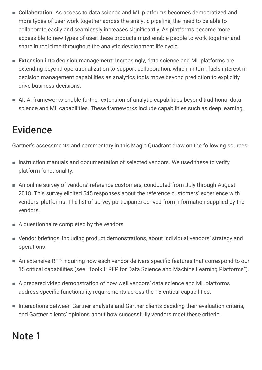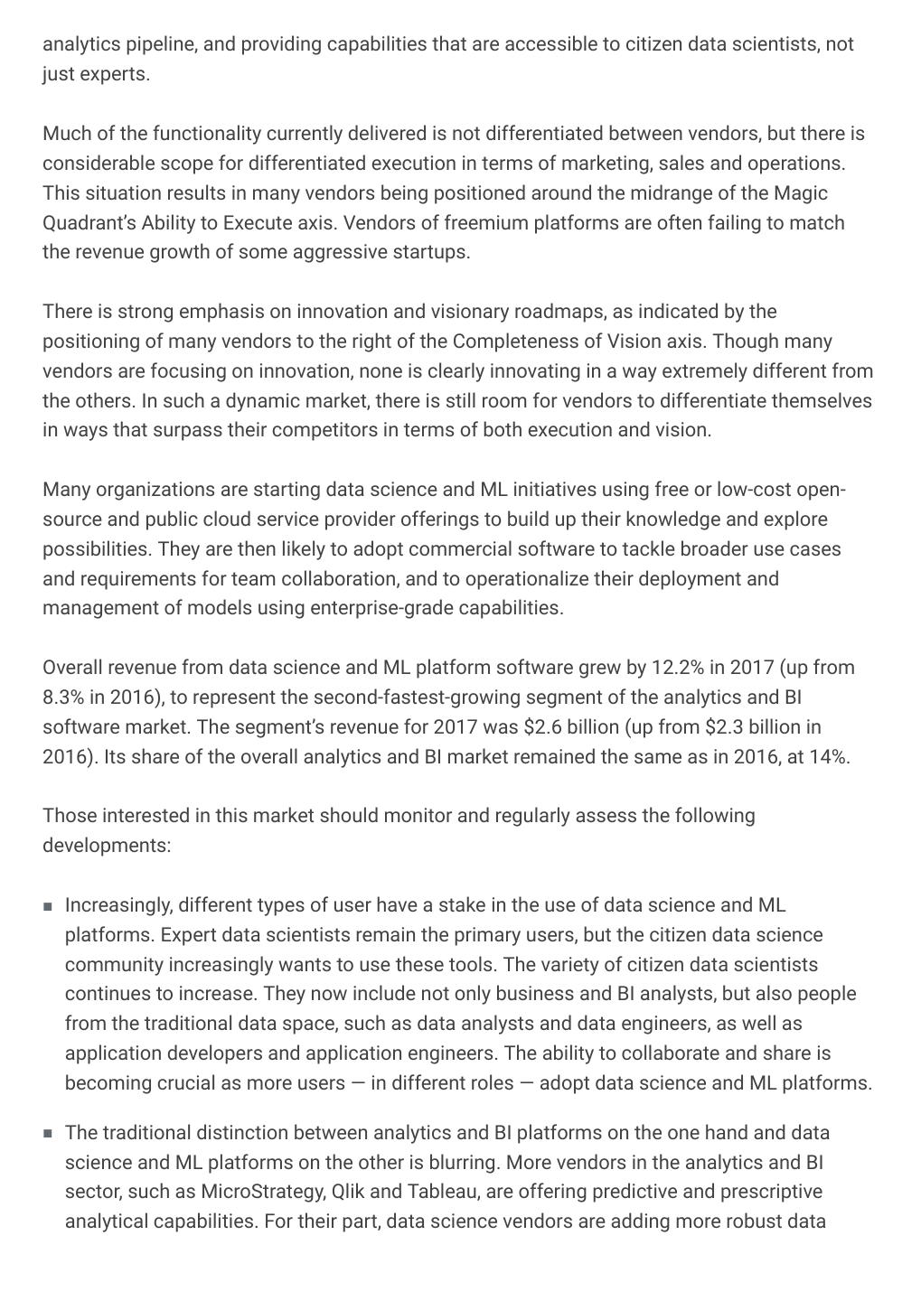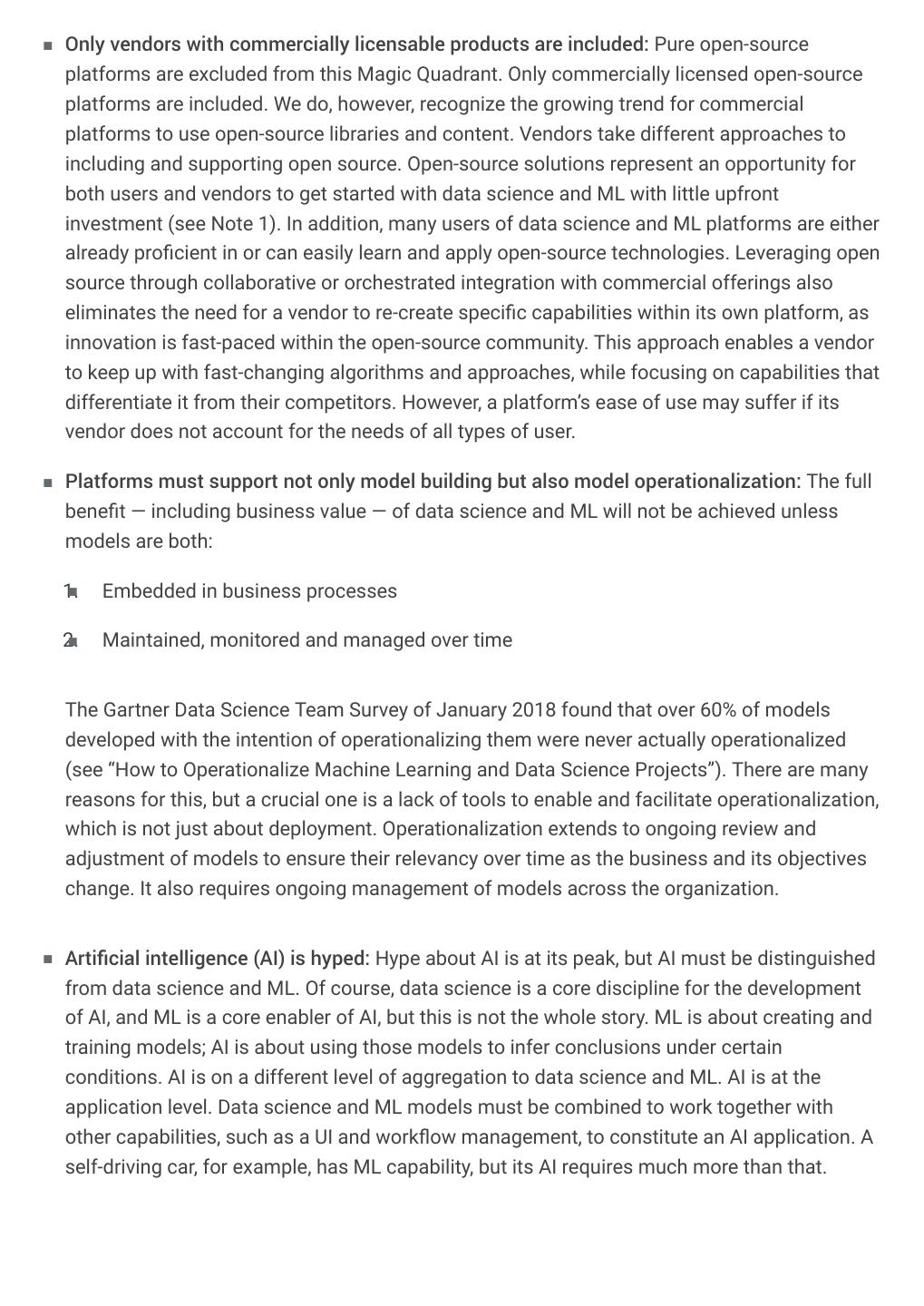 3 .■ Only vendors with commercially licensable products are included: Pure open-source platforms are excluded from this Magic Quadrant. Only commercially licensed open-source platforms are included. We do, however, recognize the growing trend for commercial platforms to use open-source libraries and content. Vendors take different approaches to including and supporting open source. Open-source solutions represent an opportunity for both users and vendors to get started with data science and ML with little upfront investment (see Note 1). In addition, many users of data science and ML platforms are either already proficient in or can easily learn and apply open-source technologies. Leveraging open source through collaborative or orchestrated integration with commercial offerings also eliminates the need for a vendor to re-create specific capabilities within its own platform, as innovation is fast-paced within the open-source community. This approach enables a vendor to keep up with fast-changing algorithms and approaches, while focusing on capabilities that differentiate it from their competitors. However, a platform’s ease of use may suffer if its vendor does not account for the needs of all types of user. ■ Platforms must support not only model building but also model operationalization: The full benefit — including business value — of data science and ML will not be achieved unless models are both: 1. ■ Embedded in business processes 2. ■ Maintained, monitored and managed over time The Gartner Data Science Team Survey of January 2018 found that over 60% of models developed with the intention of operationalizing them were never actually operationalized (see “How to Operationalize Machine Learning and Data Science Projects”). There are many reasons for this, but a crucial one is a lack of tools to enable and facilitate operationalization, which is not just about deployment. Operationalization extends to ongoing review and adjustment of models to ensure their relevancy over time as the business and its objectives change. It also requires ongoing management of models across the organization. ■ Artificial intelligence (AI) is hyped: Hype about AI is at its peak, but AI must be distinguished from data science and ML. Of course, data science is a core discipline for the development of AI, and ML is a core enabler of AI, but this is not the whole story. ML is about creating and training models; AI is about using those models to infer conclusions under certain conditions. AI is on a different level of aggregation to data science and ML. AI is at the application level. Data science and ML models must be combined to work together with other capabilities, such as a UI and workflow management, to constitute an AI application. A self-driving car, for example, has ML capability, but its AI requires much more than that.