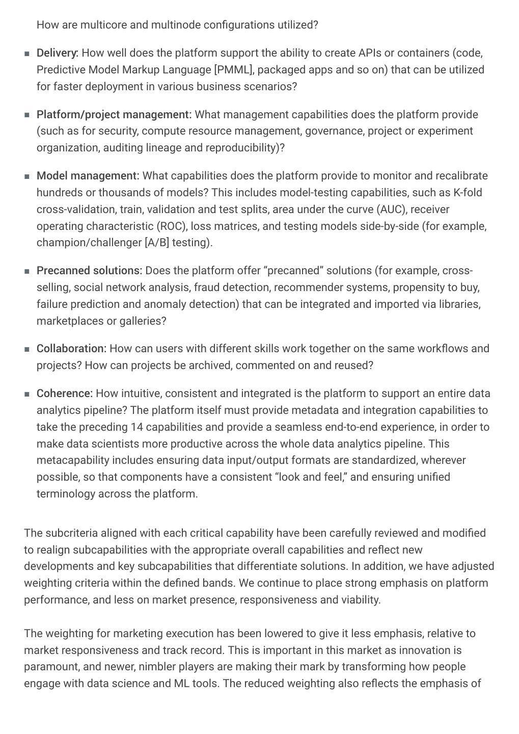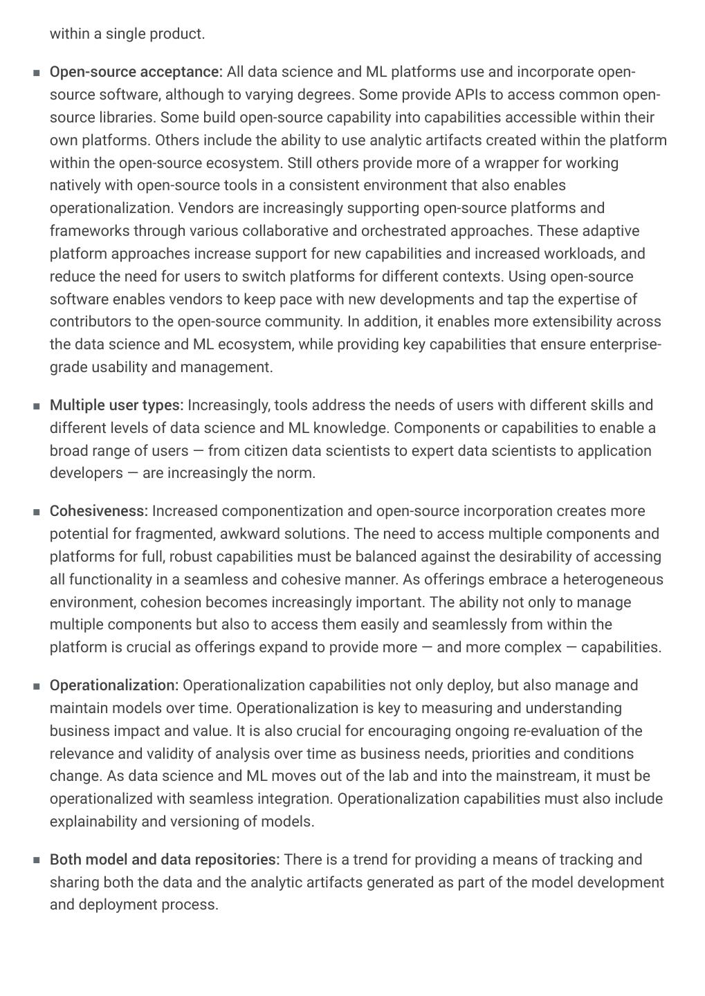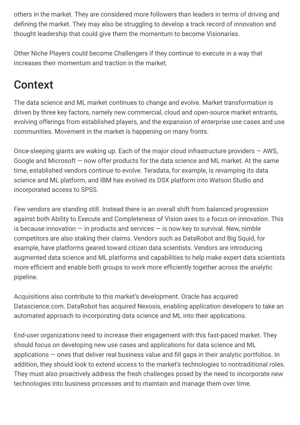 3 .■ Only vendors with commercially licensable products are included: Pure open-source platforms are excluded from this Magic Quadrant. Only commercially licensed open-source platforms are included. We do, however, recognize the growing trend for commercial platforms to use open-source libraries and content. Vendors take different approaches to including and supporting open source. Open-source solutions represent an opportunity for both users and vendors to get started with data science and ML with little upfront investment (see Note 1). In addition, many users of data science and ML platforms are either already proficient in or can easily learn and apply open-source technologies. Leveraging open source through collaborative or orchestrated integration with commercial offerings also eliminates the need for a vendor to re-create specific capabilities within its own platform, as innovation is fast-paced within the open-source community. This approach enables a vendor to keep up with fast-changing algorithms and approaches, while focusing on capabilities that differentiate it from their competitors. However, a platform’s ease of use may suffer if its vendor does not account for the needs of all types of user. ■ Platforms must support not only model building but also model operationalization: The full benefit — including business value — of data science and ML will not be achieved unless models are both: 1. ■ Embedded in business processes 2. ■ Maintained, monitored and managed over time The Gartner Data Science Team Survey of January 2018 found that over 60% of models developed with the intention of operationalizing them were never actually operationalized (see “How to Operationalize Machine Learning and Data Science Projects”). There are many reasons for this, but a crucial one is a lack of tools to enable and facilitate operationalization, which is not just about deployment. Operationalization extends to ongoing review and adjustment of models to ensure their relevancy over time as the business and its objectives change. It also requires ongoing management of models across the organization. ■ Artificial intelligence (AI) is hyped: Hype about AI is at its peak, but AI must be distinguished from data science and ML. Of course, data science is a core discipline for the development of AI, and ML is a core enabler of AI, but this is not the whole story. ML is about creating and training models; AI is about using those models to infer conclusions under certain conditions. AI is on a different level of aggregation to data science and ML. AI is at the application level. Data science and ML models must be combined to work together with other capabilities, such as a UI and workflow management, to constitute an AI application. A self-driving car, for example, has ML capability, but its AI requires much more than that.