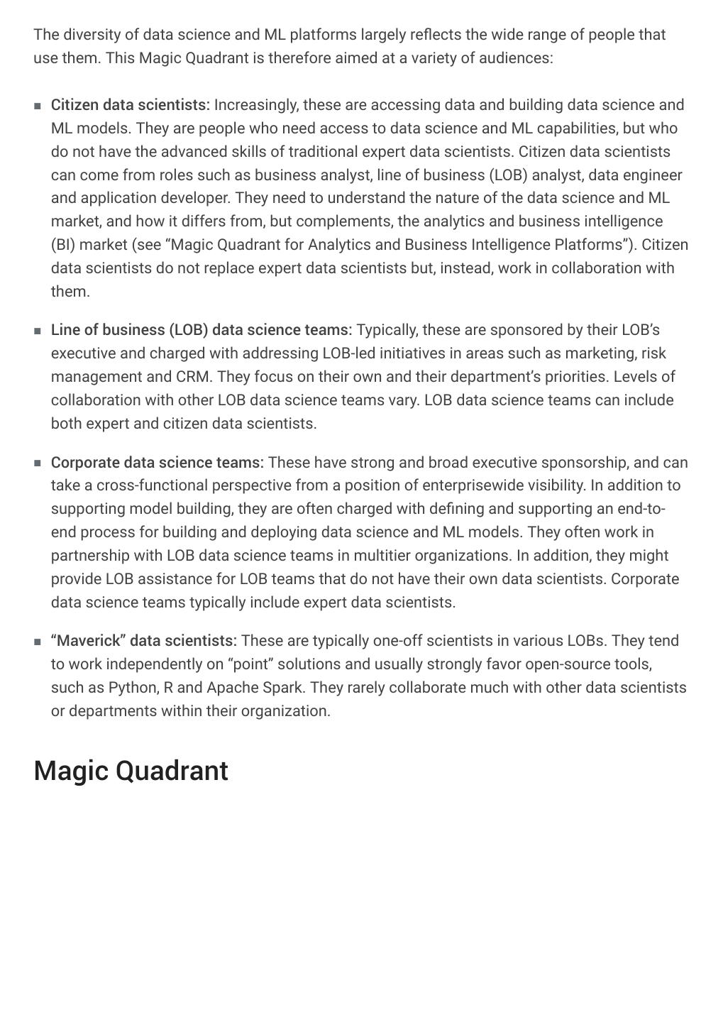 4 .The diversity of data science and ML platforms largely reflects the wide range of people that use them. This Magic Quadrant is therefore aimed at a variety of audiences: ■ Citizen data scientists: Increasingly, these are accessing data and building data science and ML models. They are people who need access to data science and ML capabilities, but who do not have the advanced skills of traditional expert data scientists. Citizen data scientists can come from roles such as business analyst, line of business (LOB) analyst, data engineer and application developer. They need to understand the nature of the data science and ML market, and how it differs from, but complements, the analytics and business intelligence (BI) market (see “Magic Quadrant for Analytics and Business Intelligence Platforms”). Citizen data scientists do not replace expert data scientists but, instead, work in collaboration with them. ■ Line of business (LOB) data science teams: Typically, these are sponsored by their LOB’s executive and charged with addressing LOB-led initiatives in areas such as marketing, risk management and CRM. They focus on their own and their department’s priorities. Levels of collaboration with other LOB data science teams vary. LOB data science teams can include both expert and citizen data scientists. ■ Corporate data science teams: These have strong and broad executive sponsorship, and can take a cross-functional perspective from a position of enterprisewide visibility. In addition to supporting model building, they are often charged with defining and supporting an end-to- end process for building and deploying data science and ML models. They often work in partnership with LOB data science teams in multitier organizations. In addition, they might provide LOB assistance for LOB teams that do not have their own data scientists. Corporate data science teams typically include expert data scientists. ■ “Maverick” data scientists: These are typically one-off scientists in various LOBs. They tend to work independently on “point” solutions and usually strongly favor open-source tools, such as Python, R and Apache Spark. They rarely collaborate much with other data scientists or departments within their organization. Magic Quadrant