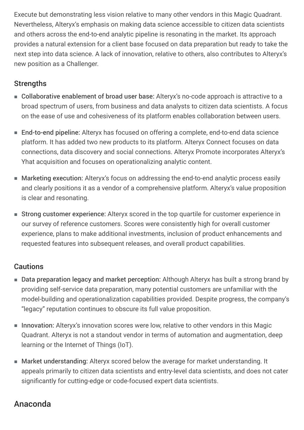 6 .Execute but demonstrating less vision relative to many other vendors in this Magic Quadrant. Nevertheless, Alteryx’s emphasis on making data science accessible to citizen data scientists and others across the end-to-end analytic pipeline is resonating in the market. Its approach provides a natural extension for a client base focused on data preparation but ready to take the next step into data science. A lack of innovation, relative to others, also contributes to Alteryx’s new position as a Challenger. Strengths ■ Collaborative enablement of broad user base: Alteryx’s no-code approach is attractive to a broad spectrum of users, from business and data analysts to citizen data scientists. A focus on the ease of use and cohesiveness of its platform enables collaboration between users. ■ End-to-end pipeline: Alteryx has focused on offering a complete, end-to-end data science platform. It has added two new products to its platform. Alteryx Connect focuses on data connections, data discovery and social connections. Alteryx Promote incorporates Alteryx’s Yhat acquisition and focuses on operationalizing analytic content. ■ Marketing execution: Alteryx’s focus on addressing the end-to-end analytic process easily and clearly positions it as a vendor of a comprehensive platform. Alteryx’s value proposition is clear and resonating. ■ Strong customer experience: Alteryx scored in the top quartile for customer experience in our survey of reference customers. Scores were consistently high for overall customer experience, plans to make additional investments, inclusion of product enhancements and requested features into subsequent releases, and overall product capabilities. Cautions ■ Data preparation legacy and market perception: Although Alteryx has built a strong brand by providing self-service data preparation, many potential customers are unfamiliar with the model-building and operationalization capabilities provided. Despite progress, the company’s “legacy” reputation continues to obscure its full value proposition. ■ Innovation: Alteryx’s innovation scores were low, relative to other vendors in this Magic Quadrant. Alteryx is not a standout vendor in terms of automation and augmentation, deep learning or the Internet of Things (IoT). ■ Market understanding: Alteryx scored below the average for market understanding. It appeals primarily to citizen data scientists and entry-level data scientists, and does not cater significantly for cutting-edge or code-focused expert data scientists. Anaconda