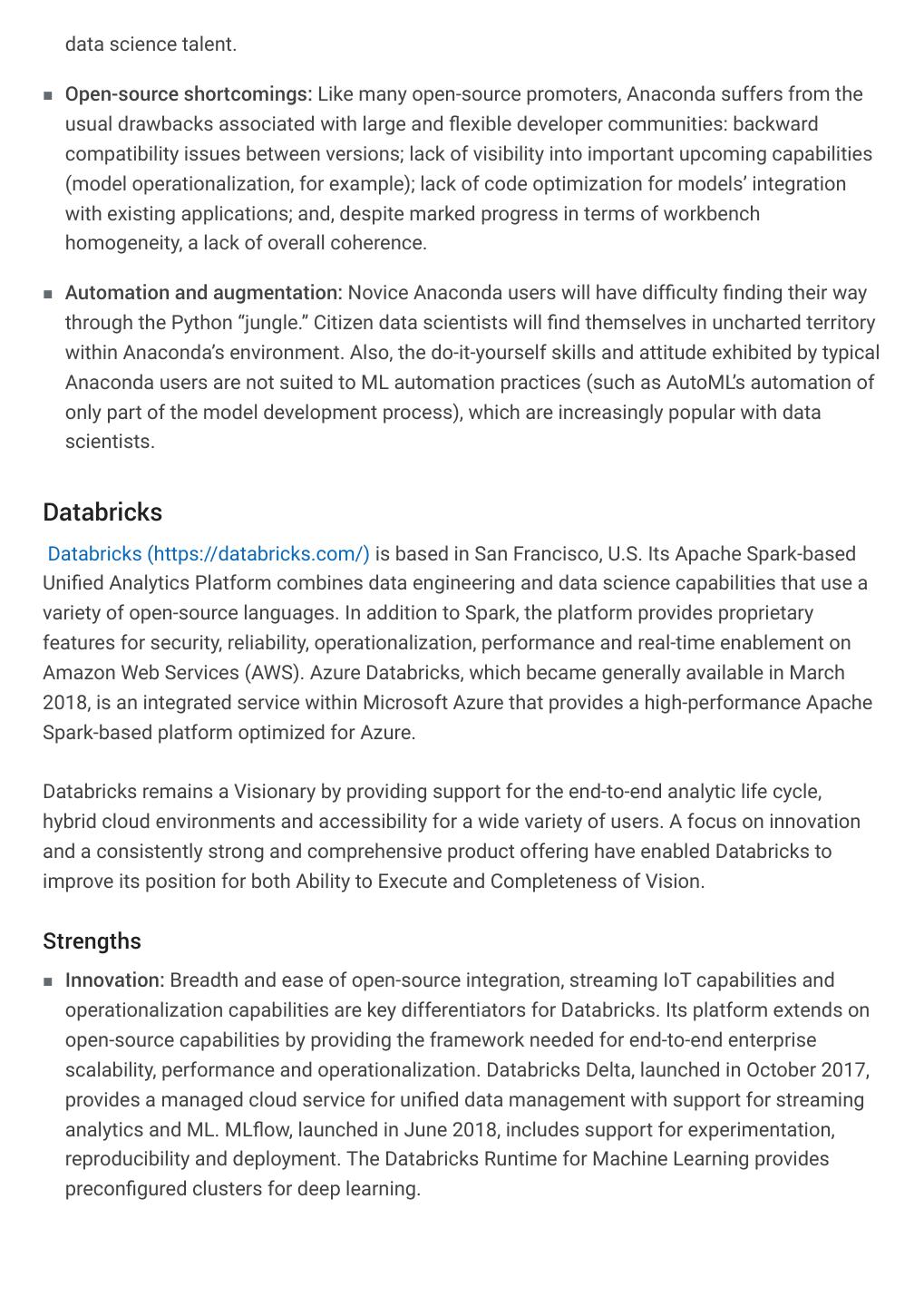 8 . data science talent. ■ Open-source shortcomings: Like many open-source promoters, Anaconda suffers from the usual drawbacks associated with large and flexible developer communities: backward compatibility issues between versions; lack of visibility into important upcoming capabilities (model operationalization, for example); lack of code optimization for models’ integration with existing applications; and, despite marked progress in terms of workbench homogeneity, a lack of overall coherence. ■ Automation and augmentation: Novice Anaconda users will have difficulty finding their way through the Python “jungle.” Citizen data scientists will find themselves in uncharted territory within Anaconda’s environment. Also, the do-it-yourself skills and attitude exhibited by typical Anaconda users are not suited to ML automation practices (such as AutoML’s automation of only part of the model development process), which are increasingly popular with data scientists. Databricks Databricks (https://databricks.com/) is based in San Francisco, U.S. Its Apache Spark-based Unified Analytics Platform combines data engineering and data science capabilities that use a variety of open-source languages. In addition to Spark, the platform provides proprietary features for security, reliability, operationalization, performance and real-time enablement on Amazon Web Services (AWS). Azure Databricks, which became generally available in March 2018, is an integrated service within Microsoft Azure that provides a high-performance Apache Spark-based platform optimized for Azure. Databricks remains a Visionary by providing support for the end-to-end analytic life cycle, hybrid cloud environments and accessibility for a wide variety of users. A focus on innovation and a consistently strong and comprehensive product offering have enabled Databricks to improve its position for both Ability to Execute and Completeness of Vision. Strengths ■ Innovation: Breadth and ease of open-source integration, streaming IoT capabilities and operationalization capabilities are key differentiators for Databricks. Its platform extends on open-source capabilities by providing the framework needed for end-to-end enterprise scalability, performance and operationalization. Databricks Delta, launched in October 2017, provides a managed cloud service for unified data management with support for streaming analytics and ML. MLflow, launched in June 2018, includes support for experimentation, reproducibility and deployment. The Databricks Runtime for Machine Learning provides preconfigured clusters for deep learning.
