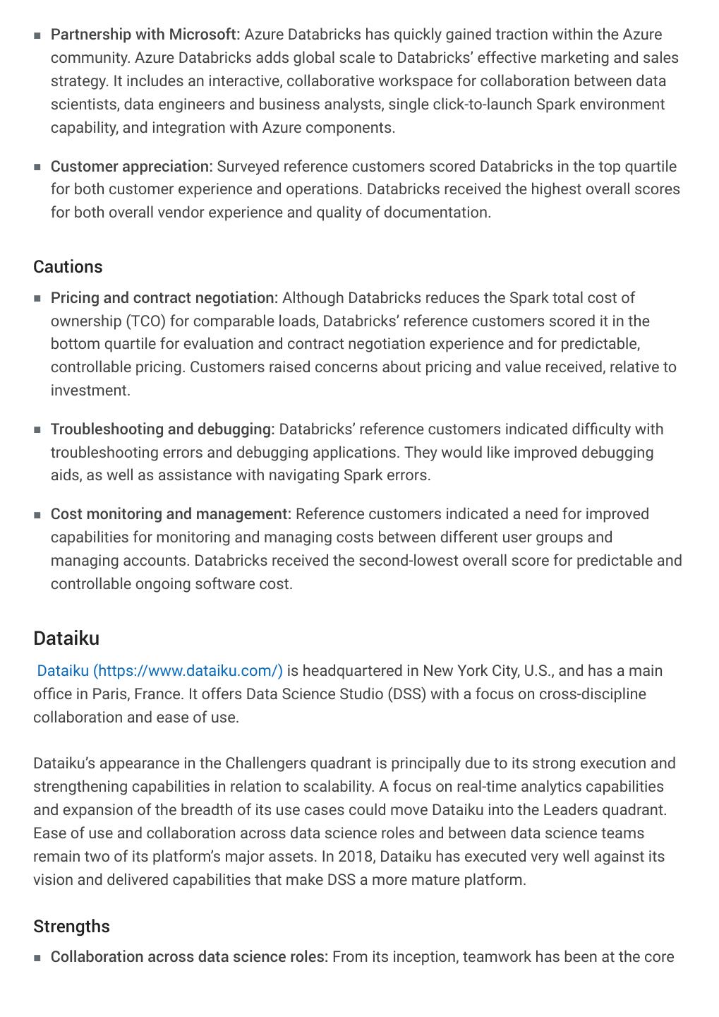 9 .■ Partnership with Microsoft: Azure Databricks has quickly gained traction within the Azure community. Azure Databricks adds global scale to Databricks’ effective marketing and sales strategy. It includes an interactive, collaborative workspace for collaboration between data scientists, data engineers and business analysts, single click-to-launch Spark environment capability, and integration with Azure components. ■ Customer appreciation: Surveyed reference customers scored Databricks in the top quartile for both customer experience and operations. Databricks received the highest overall scores for both overall vendor experience and quality of documentation. Cautions ■ Pricing and contract negotiation: Although Databricks reduces the Spark total cost of ownership (TCO) for comparable loads, Databricks’ reference customers scored it in the bottom quartile for evaluation and contract negotiation experience and for predictable, controllable pricing. Customers raised concerns about pricing and value received, relative to investment. ■ Troubleshooting and debugging: Databricks’ reference customers indicated difficulty with troubleshooting errors and debugging applications. They would like improved debugging aids, as well as assistance with navigating Spark errors. ■ Cost monitoring and management: Reference customers indicated a need for improved capabilities for monitoring and managing costs between different user groups and managing accounts. Databricks received the second-lowest overall score for predictable and controllable ongoing software cost. Dataiku Dataiku (https://www.dataiku.com/) is headquartered in New York City, U.S., and has a main office in Paris, France. It offers Data Science Studio (DSS) with a focus on cross-discipline collaboration and ease of use. Dataiku’s appearance in the Challengers quadrant is principally due to its strong execution and strengthening capabilities in relation to scalability. A focus on real-time analytics capabilities and expansion of the breadth of its use cases could move Dataiku into the Leaders quadrant. Ease of use and collaboration across data science roles and between data science teams remain two of its platform’s major assets. In 2018, Dataiku has executed very well against its vision and delivered capabilities that make DSS a more mature platform. Strengths ■ Collaboration across data science roles: From its inception, teamwork has been at the core