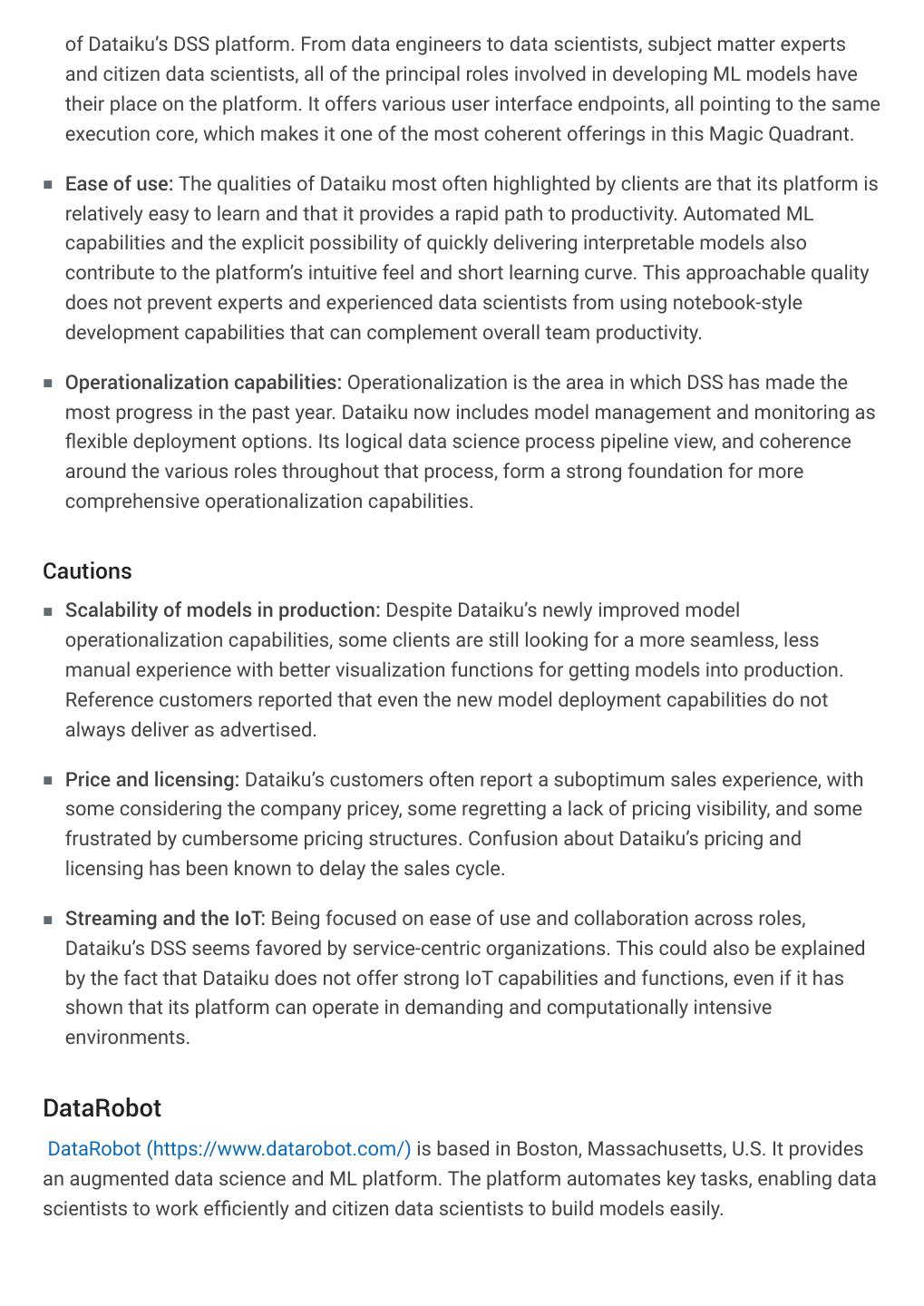 10 . of Dataiku’s DSS platform. From data engineers to data scientists, subject matter experts and citizen data scientists, all of the principal roles involved in developing ML models have their place on the platform. It offers various user interface endpoints, all pointing to the same execution core, which makes it one of the most coherent offerings in this Magic Quadrant. ■ Ease of use: The qualities of Dataiku most often highlighted by clients are that its platform is relatively easy to learn and that it provides a rapid path to productivity. Automated ML capabilities and the explicit possibility of quickly delivering interpretable models also contribute to the platform’s intuitive feel and short learning curve. This approachable quality does not prevent experts and experienced data scientists from using notebook-style development capabilities that can complement overall team productivity. ■ Operationalization capabilities: Operationalization is the area in which DSS has made the most progress in the past year. Dataiku now includes model management and monitoring as flexible deployment options. Its logical data science process pipeline view, and coherence around the various roles throughout that process, form a strong foundation for more comprehensive operationalization capabilities. Cautions ■ Scalability of models in production: Despite Dataiku’s newly improved model operationalization capabilities, some clients are still looking for a more seamless, less manual experience with better visualization functions for getting models into production. Reference customers reported that even the new model deployment capabilities do not always deliver as advertised. ■ Price and licensing: Dataiku’s customers often report a suboptimum sales experience, with some considering the company pricey, some regretting a lack of pricing visibility, and some frustrated by cumbersome pricing structures. Confusion about Dataiku’s pricing and licensing has been known to delay the sales cycle. ■ Streaming and the IoT: Being focused on ease of use and collaboration across roles, Dataiku’s DSS seems favored by service-centric organizations. This could also be explained by the fact that Dataiku does not offer strong IoT capabilities and functions, even if it has shown that its platform can operate in demanding and computationally intensive environments. DataRobot DataRobot (https://www.datarobot.com/) is based in Boston, Massachusetts, U.S. It provides an augmented data science and ML platform. The platform automates key tasks, enabling data scientists to work efficiently and citizen data scientists to build models easily.