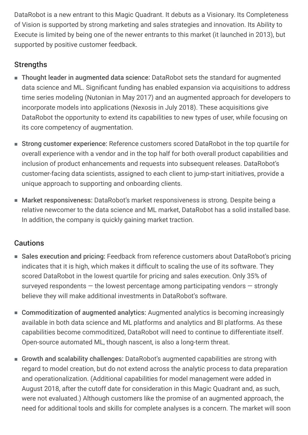 11 .DataRobot is a new entrant to this Magic Quadrant. It debuts as a Visionary. Its Completeness of Vision is supported by strong marketing and sales strategies and innovation. Its Ability to Execute is limited by being one of the newer entrants to this market (it launched in 2013), but supported by positive customer feedback. Strengths ■ Thought leader in augmented data science: DataRobot sets the standard for augmented data science and ML. Significant funding has enabled expansion via acquisitions to address time series modeling (Nutonian in May 2017) and an augmented approach for developers to incorporate models into applications (Nexosis in July 2018). These acquisitions give DataRobot the opportunity to extend its capabilities to new types of user, while focusing on its core competency of augmentation. ■ Strong customer experience: Reference customers scored DataRobot in the top quartile for overall experience with a vendor and in the top half for both overall product capabilities and inclusion of product enhancements and requests into subsequent releases. DataRobot’s customer-facing data scientists, assigned to each client to jump-start initiatives, provide a unique approach to supporting and onboarding clients. ■ Market responsiveness: DataRobot’s market responsiveness is strong. Despite being a relative newcomer to the data science and ML market, DataRobot has a solid installed base. In addition, the company is quickly gaining market traction. Cautions ■ Sales execution and pricing: Feedback from reference customers about DataRobot’s pricing indicates that it is high, which makes it difficult to scaling the use of its software. They scored DataRobot in the lowest quartile for pricing and sales execution. Only 35% of surveyed respondents — the lowest percentage among participating vendors — strongly believe they will make additional investments in DataRobot’s software. ■ Commoditization of augmented analytics: Augmented analytics is becoming increasingly available in both data science and ML platforms and analytics and BI platforms. As these capabilities become commoditized, DataRobot will need to continue to differentiate itself. Open-source automated ML, though nascent, is also a long-term threat. ■ Growth and scalability challenges: DataRobot’s augmented capabilities are strong with regard to model creation, but do not extend across the analytic process to data preparation and operationalization. (Additional capabilities for model management were added in August 2018, after the cutoff date for consideration in this Magic Quadrant and, as such, were not evaluated.) Although customers like the promise of an augmented approach, the need for additional tools and skills for complete analyses is a concern. The market will soon
