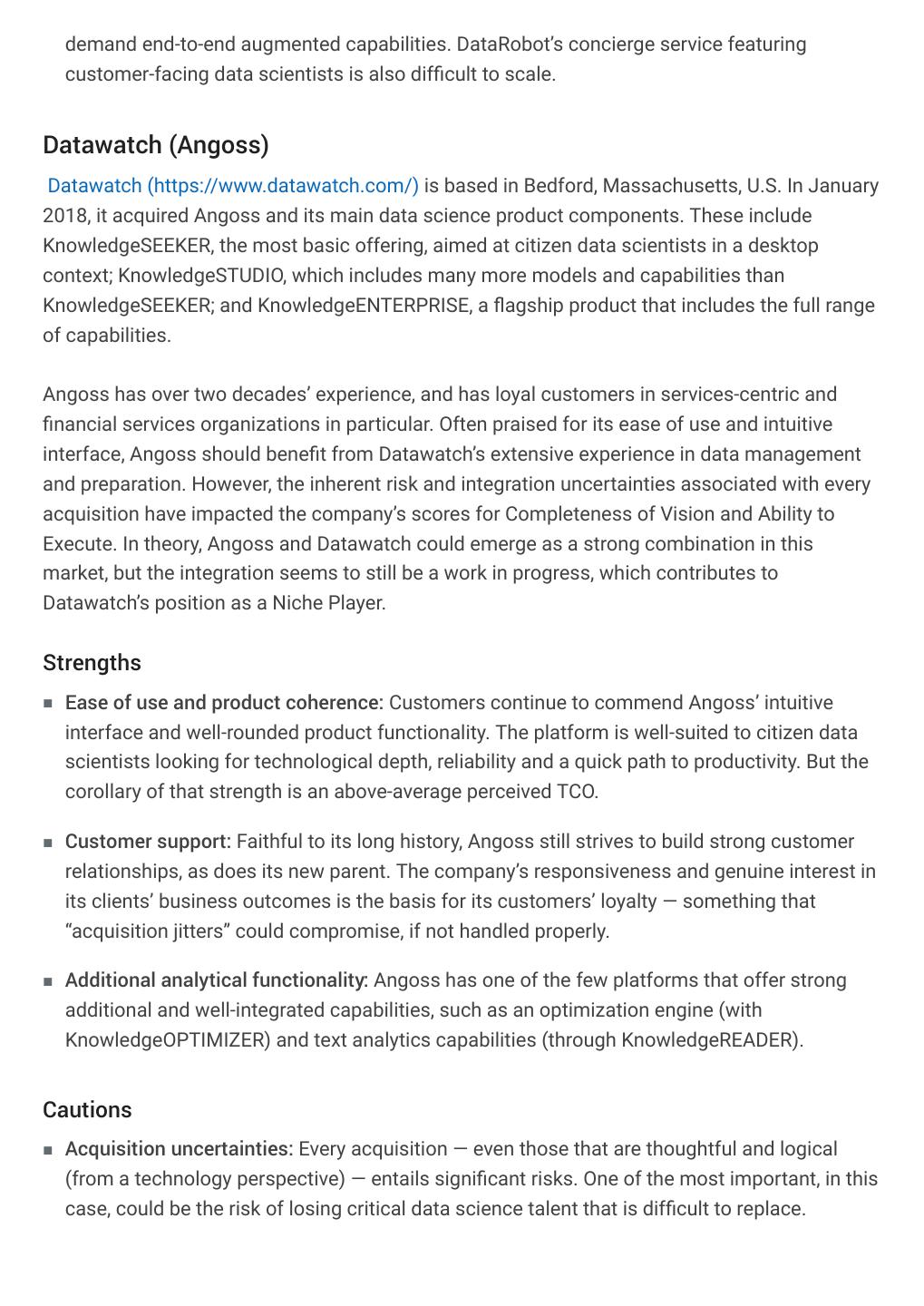 12 . demand end-to-end augmented capabilities. DataRobot’s concierge service featuring customer-facing data scientists is also difficult to scale. Datawatch (Angoss) Datawatch (https://www.datawatch.com/) is based in Bedford, Massachusetts, U.S. In January 2018, it acquired Angoss and its main data science product components. These include KnowledgeSEEKER, the most basic offering, aimed at citizen data scientists in a desktop context; KnowledgeSTUDIO, which includes many more models and capabilities than KnowledgeSEEKER; and KnowledgeENTERPRISE, a flagship product that includes the full range of capabilities. Angoss has over two decades’ experience, and has loyal customers in services-centric and financial services organizations in particular. Often praised for its ease of use and intuitive interface, Angoss should benefit from Datawatch’s extensive experience in data management and preparation. However, the inherent risk and integration uncertainties associated with every acquisition have impacted the company’s scores for Completeness of Vision and Ability to Execute. In theory, Angoss and Datawatch could emerge as a strong combination in this market, but the integration seems to still be a work in progress, which contributes to Datawatch’s position as a Niche Player. Strengths ■ Ease of use and product coherence: Customers continue to commend Angoss’ intuitive interface and well-rounded product functionality. The platform is well-suited to citizen data scientists looking for technological depth, reliability and a quick path to productivity. But the corollary of that strength is an above-average perceived TCO. ■ Customer support: Faithful to its long history, Angoss still strives to build strong customer relationships, as does its new parent. The company’s responsiveness and genuine interest in its clients’ business outcomes is the basis for its customers’ loyalty — something that “acquisition jitters” could compromise, if not handled properly. ■ Additional analytical functionality: Angoss has one of the few platforms that offer strong additional and well-integrated capabilities, such as an optimization engine (with KnowledgeOPTIMIZER) and text analytics capabilities (through KnowledgeREADER). Cautions ■ Acquisition uncertainties: Every acquisition — even those that are thoughtful and logical (from a technology perspective) — entails significant risks. One of the most important, in this case, could be the risk of losing critical data science talent that is difficult to replace.