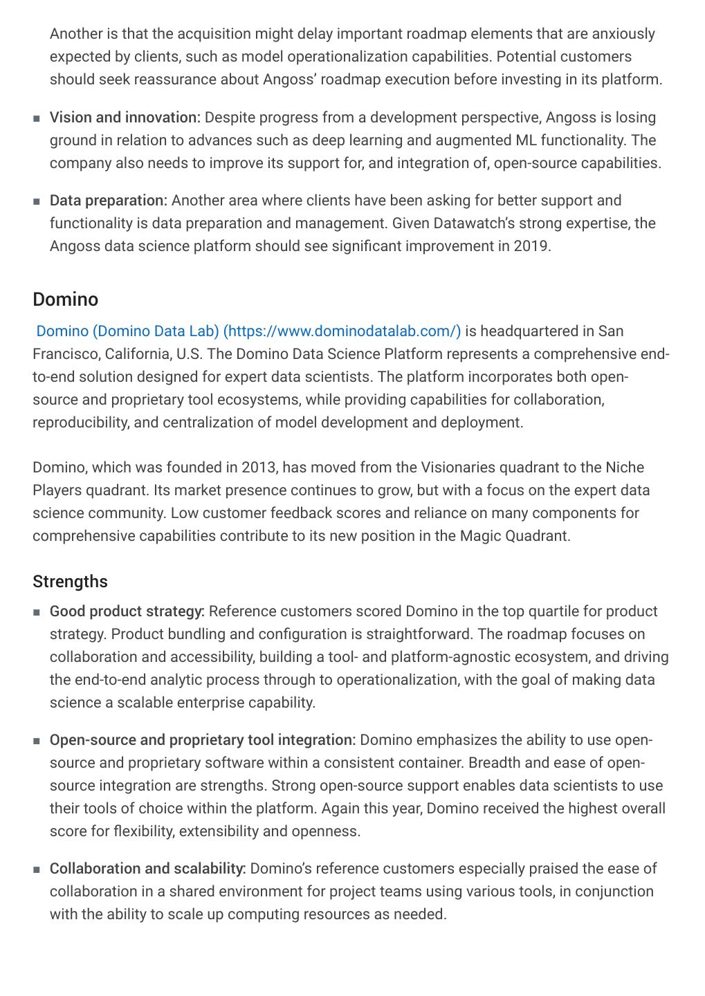 13 . Another is that the acquisition might delay important roadmap elements that are anxiously expected by clients, such as model operationalization capabilities. Potential customers should seek reassurance about Angoss’ roadmap execution before investing in its platform. ■ Vision and innovation: Despite progress from a development perspective, Angoss is losing ground in relation to advances such as deep learning and augmented ML functionality. The company also needs to improve its support for, and integration of, open-source capabilities. ■ Data preparation: Another area where clients have been asking for better support and functionality is data preparation and management. Given Datawatch’s strong expertise, the Angoss data science platform should see significant improvement in 2019. Domino Domino (Domino Data Lab) (https://www.dominodatalab.com/) is headquartered in San Francisco, California, U.S. The Domino Data Science Platform represents a comprehensive end- to-end solution designed for expert data scientists. The platform incorporates both open- source and proprietary tool ecosystems, while providing capabilities for collaboration, reproducibility, and centralization of model development and deployment. Domino, which was founded in 2013, has moved from the Visionaries quadrant to the Niche Players quadrant. Its market presence continues to grow, but with a focus on the expert data science community. Low customer feedback scores and reliance on many components for comprehensive capabilities contribute to its new position in the Magic Quadrant. Strengths ■ Good product strategy: Reference customers scored Domino in the top quartile for product strategy. Product bundling and configuration is straightforward. The roadmap focuses on collaboration and accessibility, building a tool- and platform-agnostic ecosystem, and driving the end-to-end analytic process through to operationalization, with the goal of making data science a scalable enterprise capability. ■ Open-source and proprietary tool integration: Domino emphasizes the ability to use open- source and proprietary software within a consistent container. Breadth and ease of open- source integration are strengths. Strong open-source support enables data scientists to use their tools of choice within the platform. Again this year, Domino received the highest overall score for flexibility, extensibility and openness. ■ Collaboration and scalability: Domino’s reference customers especially praised the ease of collaboration in a shared environment for project teams using various tools, in conjunction with the ability to scale up computing resources as needed.