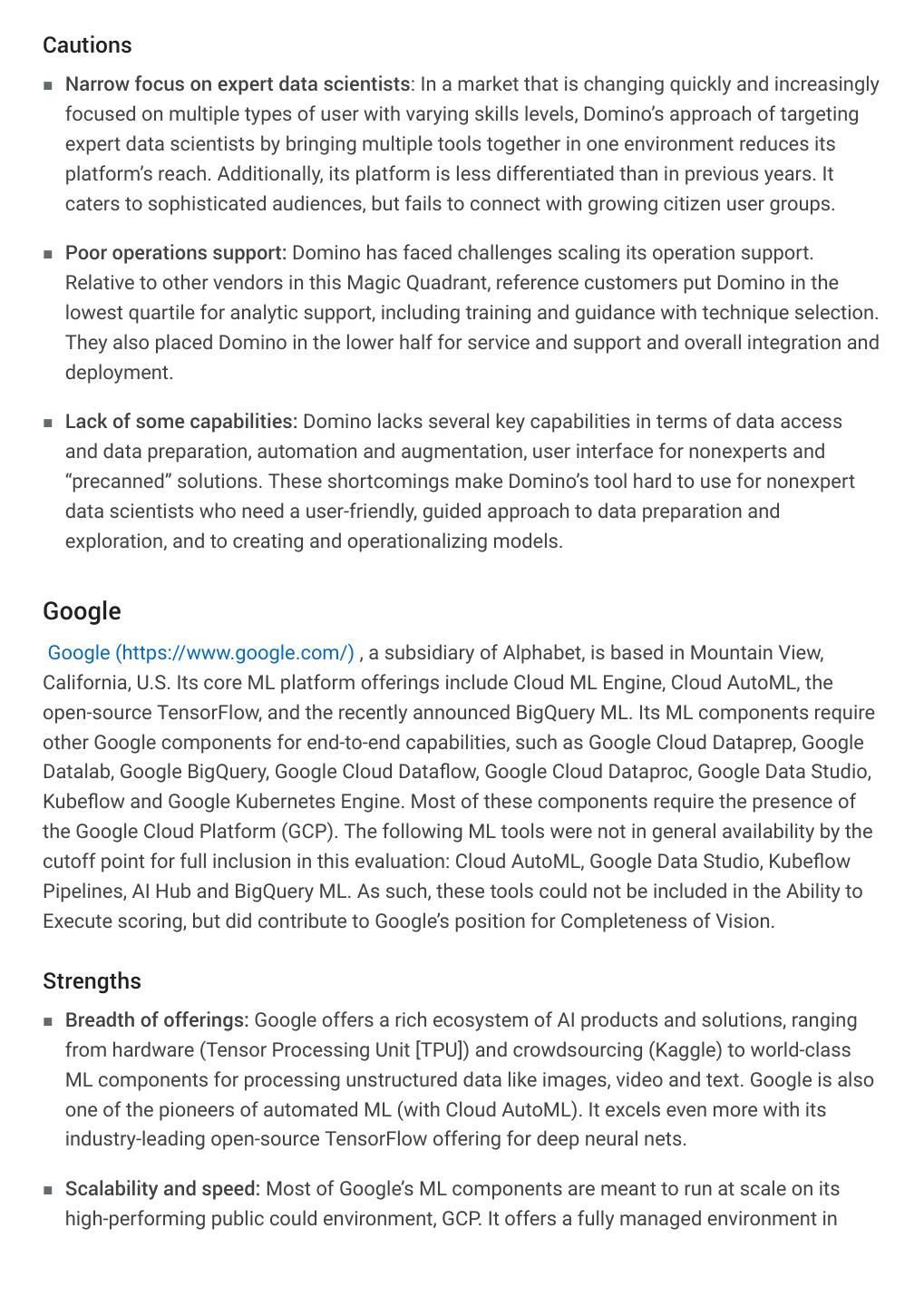14 .Cautions ■ Narrow focus on expert data scientists: In a market that is changing quickly and increasingly focused on multiple types of user with varying skills levels, Domino’s approach of targeting expert data scientists by bringing multiple tools together in one environment reduces its platform’s reach. Additionally, its platform is less differentiated than in previous years. It caters to sophisticated audiences, but fails to connect with growing citizen user groups. ■ Poor operations support: Domino has faced challenges scaling its operation support. Relative to other vendors in this Magic Quadrant, reference customers put Domino in the lowest quartile for analytic support, including training and guidance with technique selection. They also placed Domino in the lower half for service and support and overall integration and deployment. ■ Lack of some capabilities: Domino lacks several key capabilities in terms of data access and data preparation, automation and augmentation, user interface for nonexperts and “precanned” solutions. These shortcomings make Domino’s tool hard to use for nonexpert data scientists who need a user-friendly, guided approach to data preparation and exploration, and to creating and operationalizing models. Google Google (https://www.google.com/) , a subsidiary of Alphabet, is based in Mountain View, California, U.S. Its core ML platform offerings include Cloud ML Engine, Cloud AutoML, the open-source TensorFlow, and the recently announced BigQuery ML. Its ML components require other Google components for end-to-end capabilities, such as Google Cloud Dataprep, Google Datalab, Google BigQuery, Google Cloud Dataflow, Google Cloud Dataproc, Google Data Studio, Kubeflow and Google Kubernetes Engine. Most of these components require the presence of the Google Cloud Platform (GCP). The following ML tools were not in general availability by the cutoff point for full inclusion in this evaluation: Cloud AutoML, Google Data Studio, Kubeflow Pipelines, AI Hub and BigQuery ML. As such, these tools could not be included in the Ability to Execute scoring, but did contribute to Google’s position for Completeness of Vision. Strengths ■ Breadth of offerings: Google offers a rich ecosystem of AI products and solutions, ranging from hardware (Tensor Processing Unit [TPU]) and crowdsourcing (Kaggle) to world-class ML components for processing unstructured data like images, video and text. Google is also one of the pioneers of automated ML (with Cloud AutoML). It excels even more with its industry-leading open-source TensorFlow offering for deep neural nets. ■ Scalability and speed: Most of Google’s ML components are meant to run at scale on its high-performing public could environment, GCP. It offers a fully managed environment in
