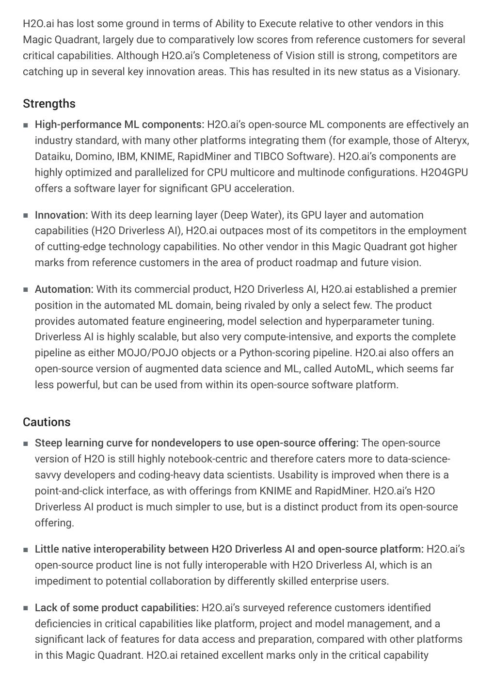 16 .H2O.ai has lost some ground in terms of Ability to Execute relative to other vendors in this Magic Quadrant, largely due to comparatively low scores from reference customers for several critical capabilities. Although H2O.ai’s Completeness of Vision still is strong, competitors are catching up in several key innovation areas. This has resulted in its new status as a Visionary. Strengths ■ High-performance ML components: H2O.ai’s open-source ML components are effectively an industry standard, with many other platforms integrating them (for example, those of Alteryx, Dataiku, Domino, IBM, KNIME, RapidMiner and TIBCO Software). H2O.ai’s components are highly optimized and parallelized for CPU multicore and multinode configurations. H2O4GPU offers a software layer for significant GPU acceleration. ■ Innovation: With its deep learning layer (Deep Water), its GPU layer and automation capabilities (H2O Driverless AI), H2O.ai outpaces most of its competitors in the employment of cutting-edge technology capabilities. No other vendor in this Magic Quadrant got higher marks from reference customers in the area of product roadmap and future vision. ■ Automation: With its commercial product, H2O Driverless AI, H2O.ai established a premier position in the automated ML domain, being rivaled by only a select few. The product provides automated feature engineering, model selection and hyperparameter tuning. Driverless AI is highly scalable, but also very compute-intensive, and exports the complete pipeline as either MOJO/POJO objects or a Python-scoring pipeline. H2O.ai also offers an open-source version of augmented data science and ML, called AutoML, which seems far less powerful, but can be used from within its open-source software platform. Cautions ■ Steep learning curve for nondevelopers to use open-source offering: The open-source version of H2O is still highly notebook-centric and therefore caters more to data-science- savvy developers and coding-heavy data scientists. Usability is improved when there is a point-and-click interface, as with offerings from KNIME and RapidMiner. H2O.ai’s H2O Driverless AI product is much simpler to use, but is a distinct product from its open-source offering. ■ Little native interoperability between H2O Driverless AI and open-source platform: H2O.ai’s open-source product line is not fully interoperable with H2O Driverless AI, which is an impediment to potential collaboration by differently skilled enterprise users. ■ Lack of some product capabilities: H2O.ai’s surveyed reference customers identified deficiencies in critical capabilities like platform, project and model management, and a significant lack of features for data access and preparation, compared with other platforms in this Magic Quadrant. H2O.ai retained excellent marks only in the critical capability